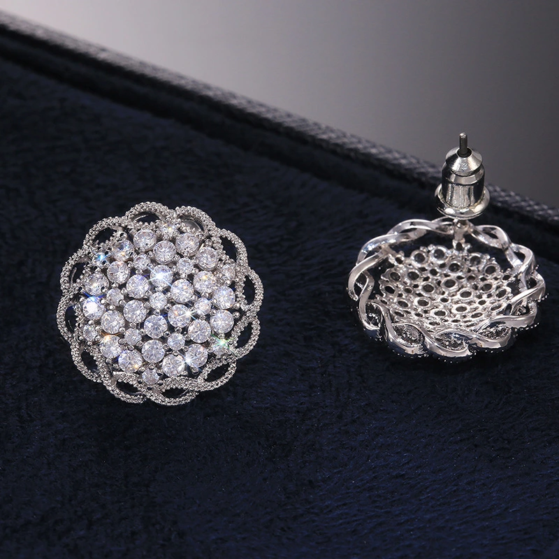 أقراط أوروبية وأمريكية جديدة فاخرة من الألماس بالكامل للبيع الساخن أقراط زهور مستديرة لحفلات الزفاف المسائية أقراط شعبية