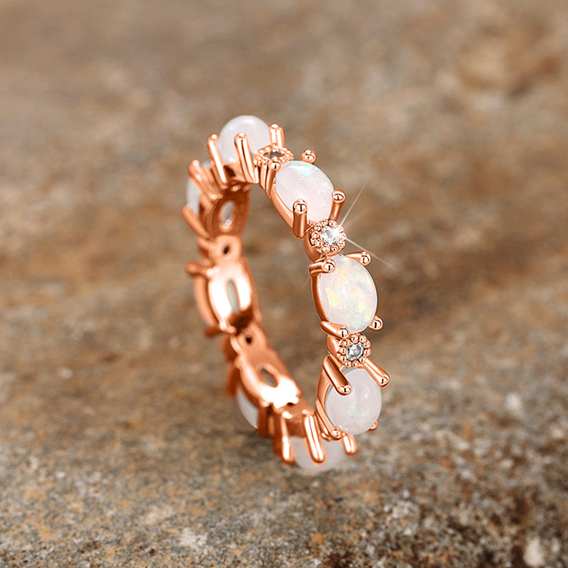 خاتم زفاف صغير بيضاوي الشكل شائع الاستخدام، مصنوع من حجر الأوبال الأبيض الناري، بتصميم دائري كامل