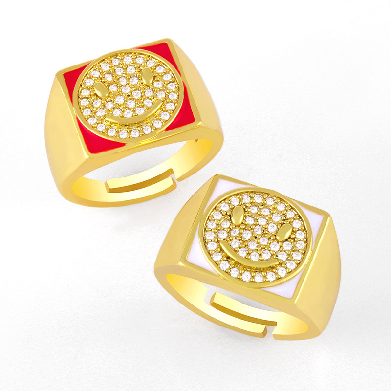 خاتم من نفس الطراز من ماركة أوروبية وأمريكية كبيرة الحجم، خاتم مفتوح على شكل وجه مبتسم لطيف، خاتم هيب هوب مربع مرصع بالزركون، rik76