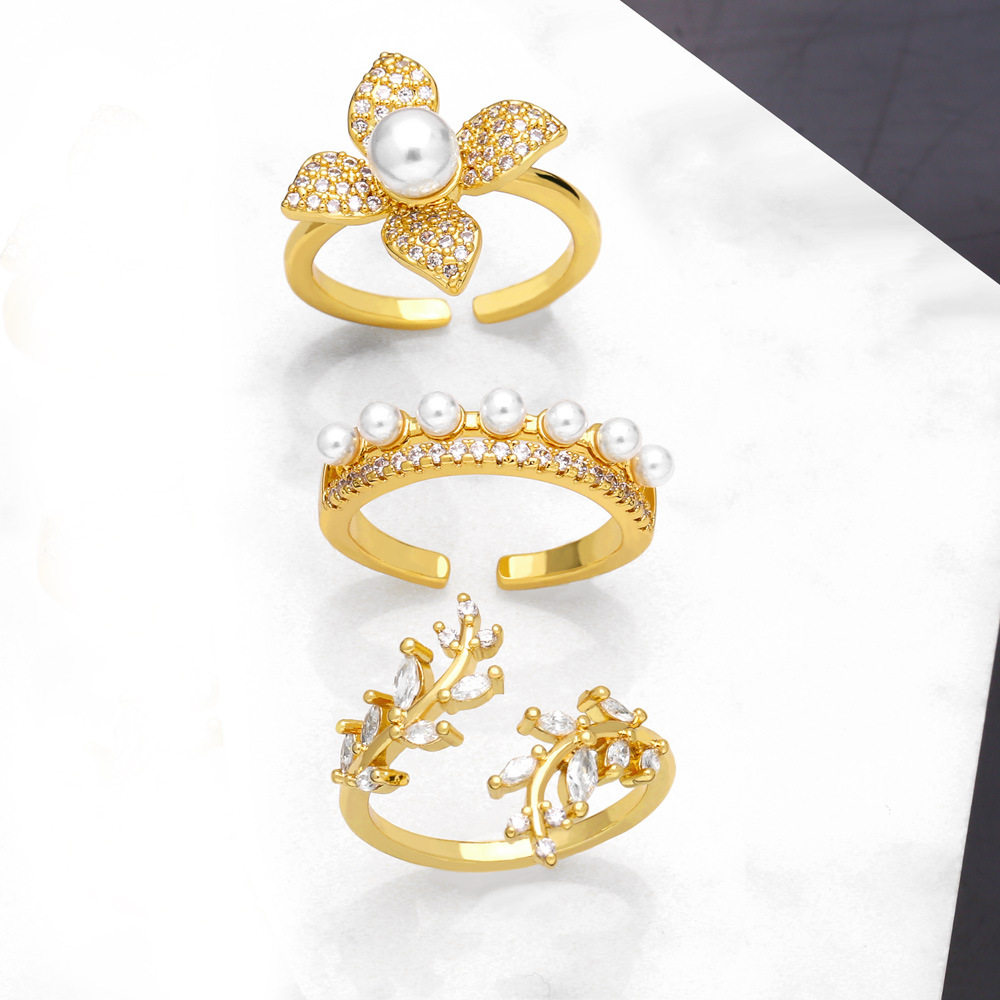 خاتم زهرة ورقة بسيطة على شكل ورقة أوروبية وأمريكية جديدة أنيقة للنساء بتصميم بارد خاتم لؤلؤ من الزركون rir61