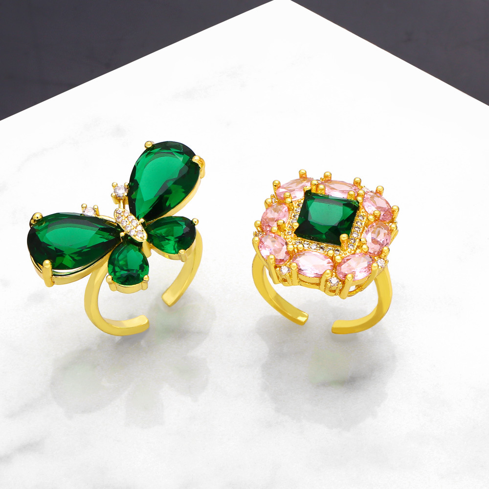 خاتم زهرة الزركون الملون بالألماس اللامع الشهير من أوروبا والولايات المتحدة الأمريكية خاتم مفتوح متعدد الاستخدامات للنساء على شكل فراشة مجوهرات يدوية rir51