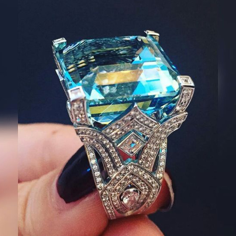 خاتم نسائي أوروبي وأمريكي جديد فاخر مرصع بالزركون الأزرق على شكل زهرة مجوفة خاتم حفلات أنيق