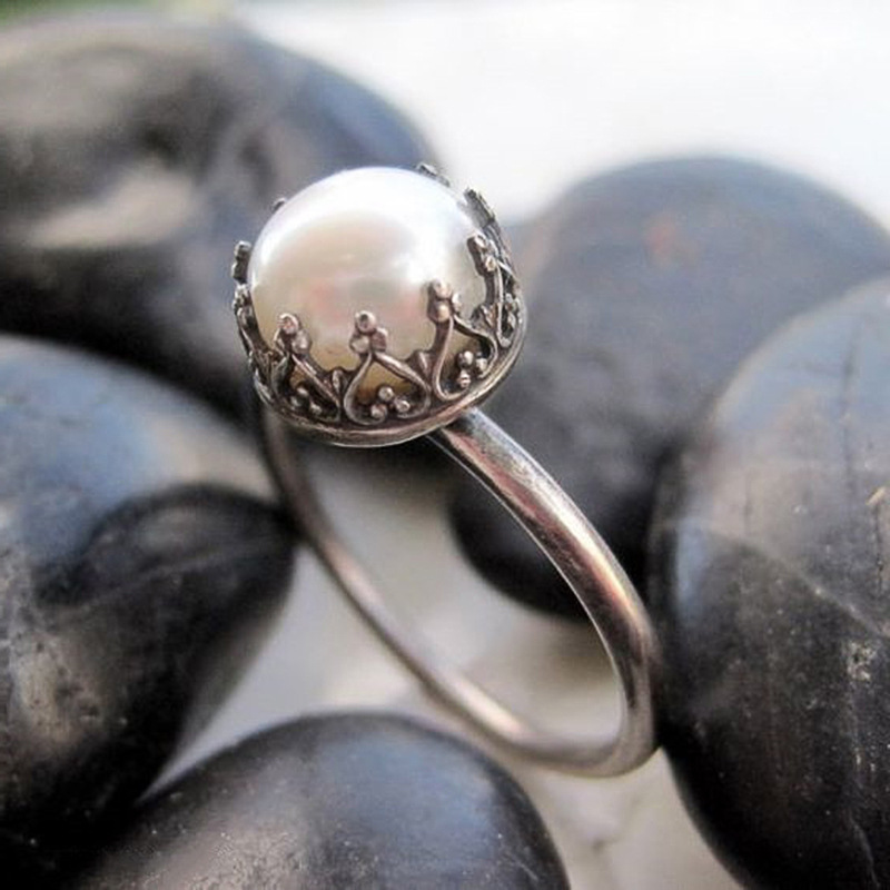 خاتم لؤلؤ تقليدي مطلي بالفضة على الطراز الباروكي بتصميم أوروبي وأمريكي بسيط من اللؤلؤ الأبيض خاتم إصبع السبابة للنساء