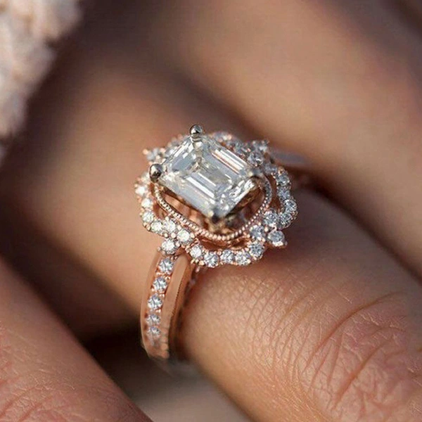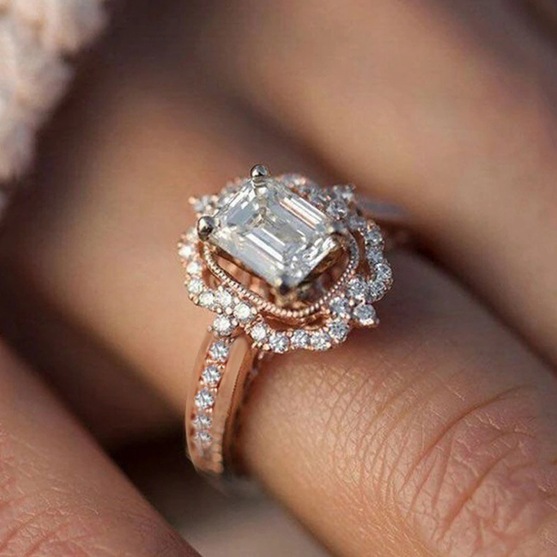 خاتم الأميرة المرصع بالألماس المربع من الزركون والمطلي بالنحاس والذهب الوردي الأكثر مبيعًا في أوروبا وأمريكا، مجوهرات الخطوبة العصرية الأوروبية والأمريكية