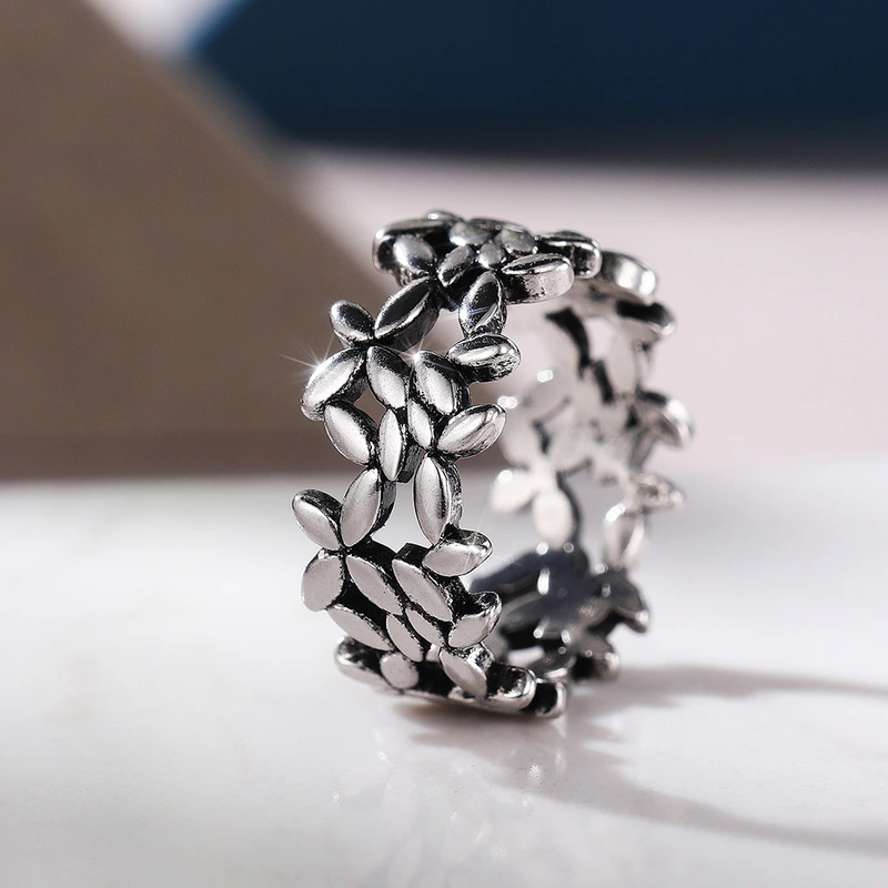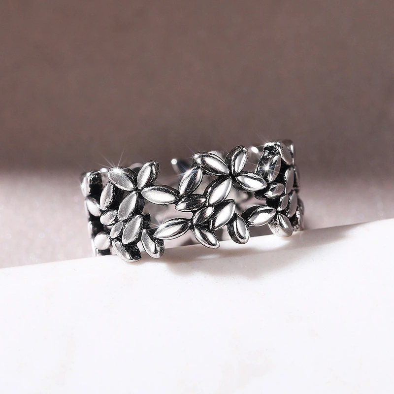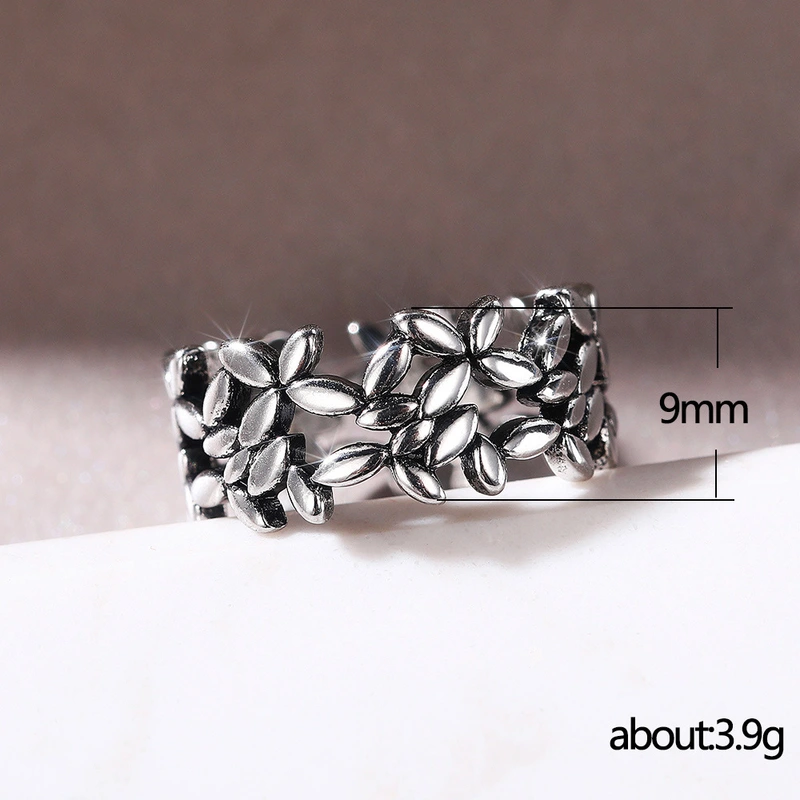 خاتم جديد من الفضة التايلاندية بتصميم أوراق الزيتون المقلدة للنساء، خاتم على شكل غصن زيتون بتلة مجوفة على الطراز القديم