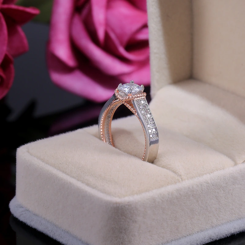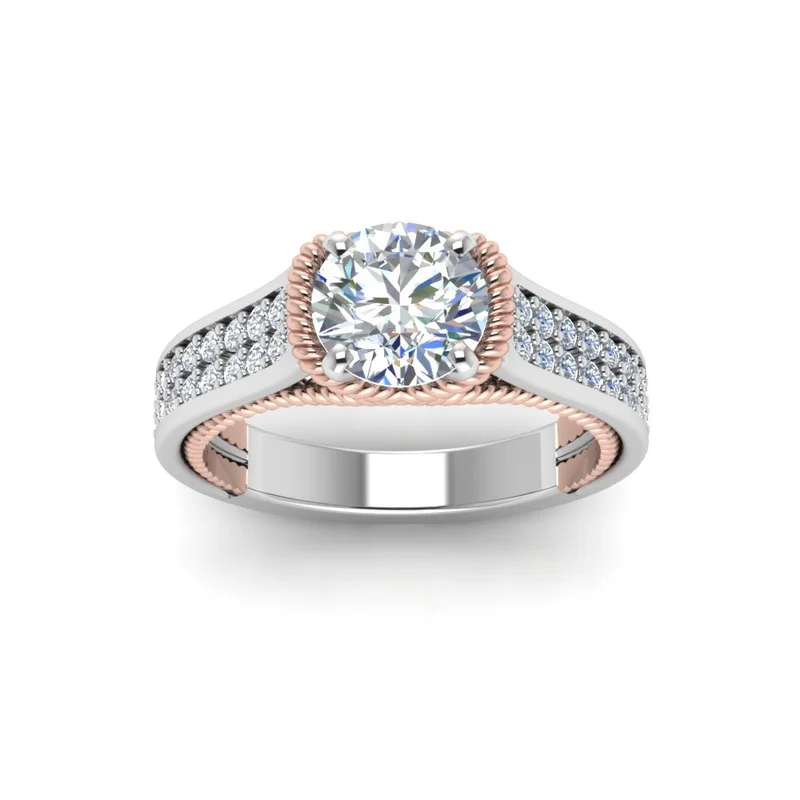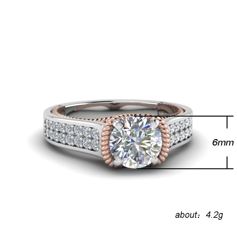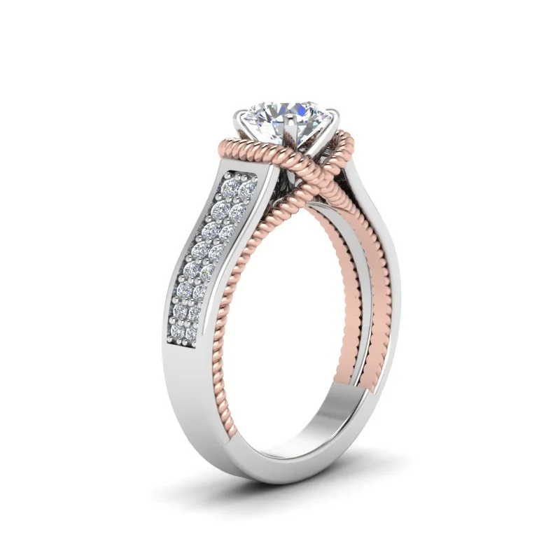 خاتم كلاسيكي مرصع بأحجار الزركون المقلد بأربعة مخالب للنساء، خاتم ذراع ملتوي مزدوج اللون، خاتم خطوبة وزواج للنساء