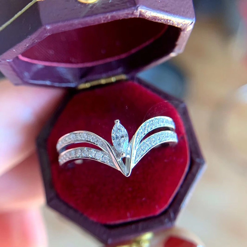 خاتم عصري وخفيف الوزن فاخر مطلي بالبلاتين على شكل حرف V من الزركون على شكل عين حصان محاكاة خاتم ألماس على شكل حرف V خاتم نسائي خاتم زفاف