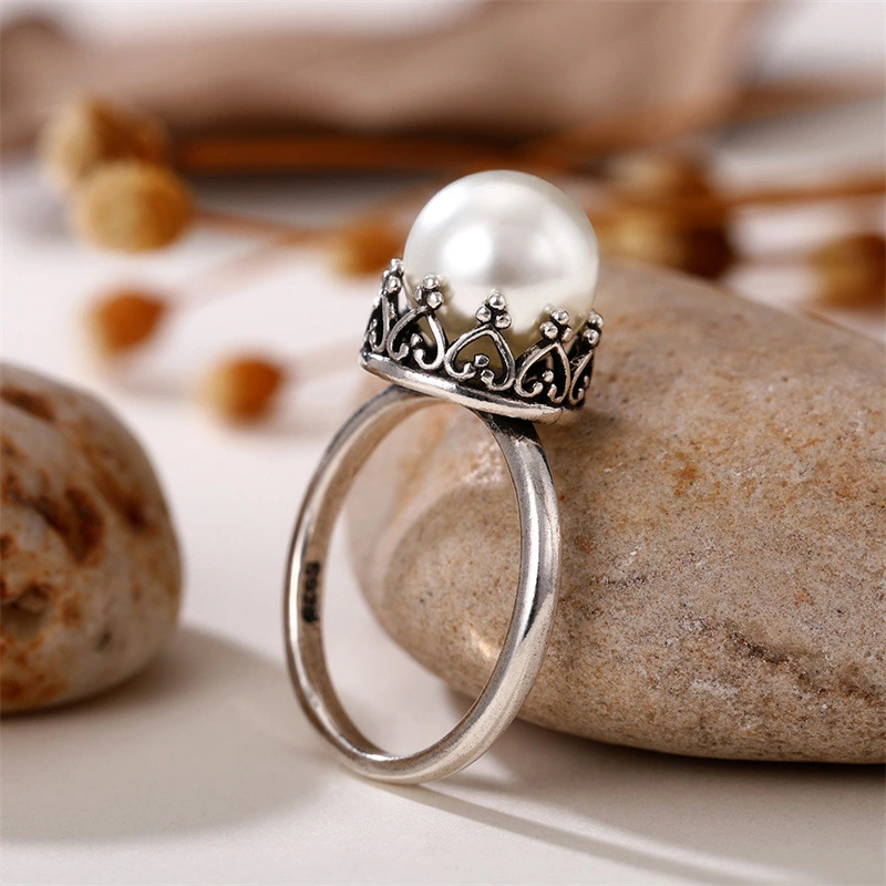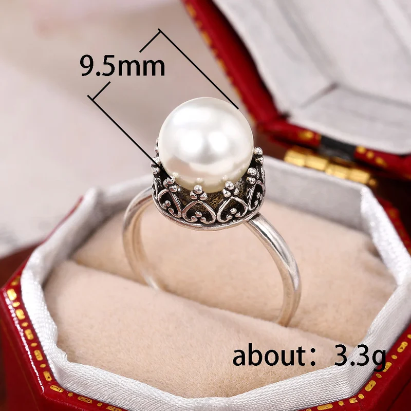 خاتم لؤلؤ تقليدي مطلي بالفضة على الطراز الباروكي بتصميم أوروبي وأمريكي بسيط من اللؤلؤ الأبيض خاتم إصبع السبابة للنساء
