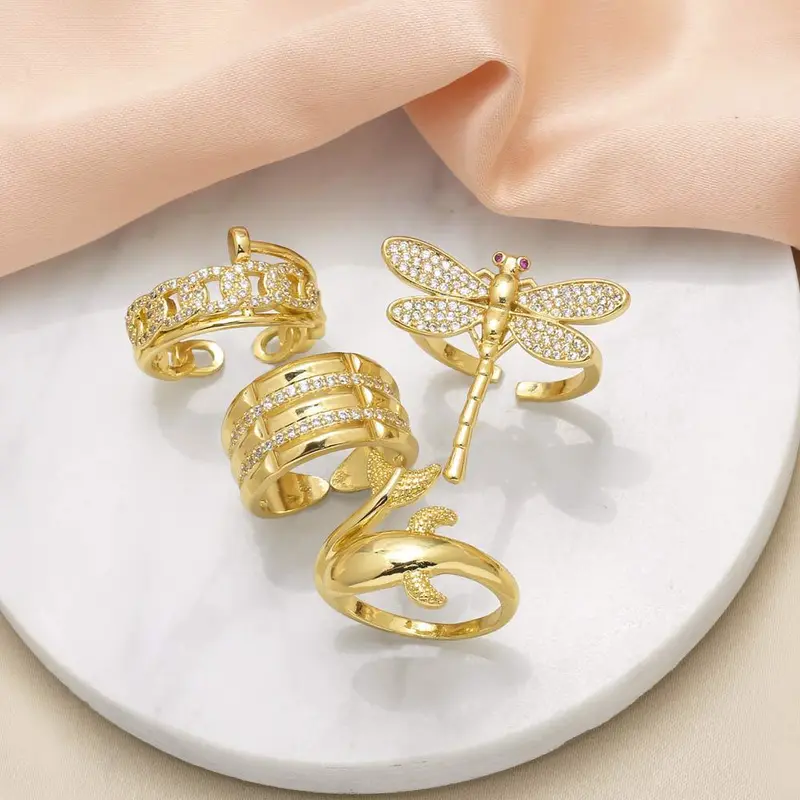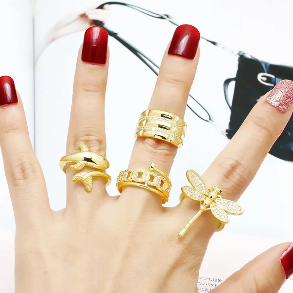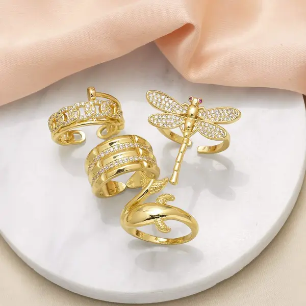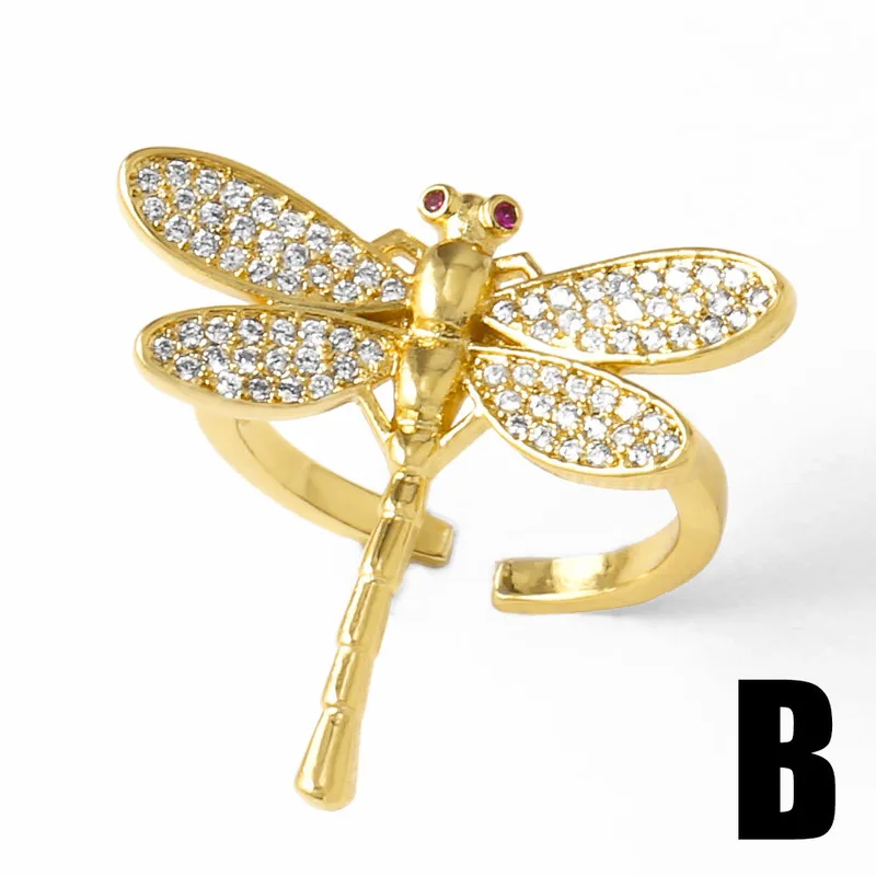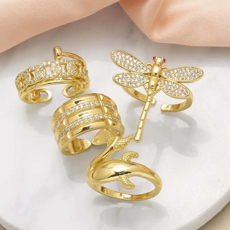خاتم مفتوح على شكل يعسوب من المجوهرات، مطلي بالنحاس، مرصع بالذهب عيار 18 قيراطًا، مرصع بالزركون، خاتم حوت، rih82