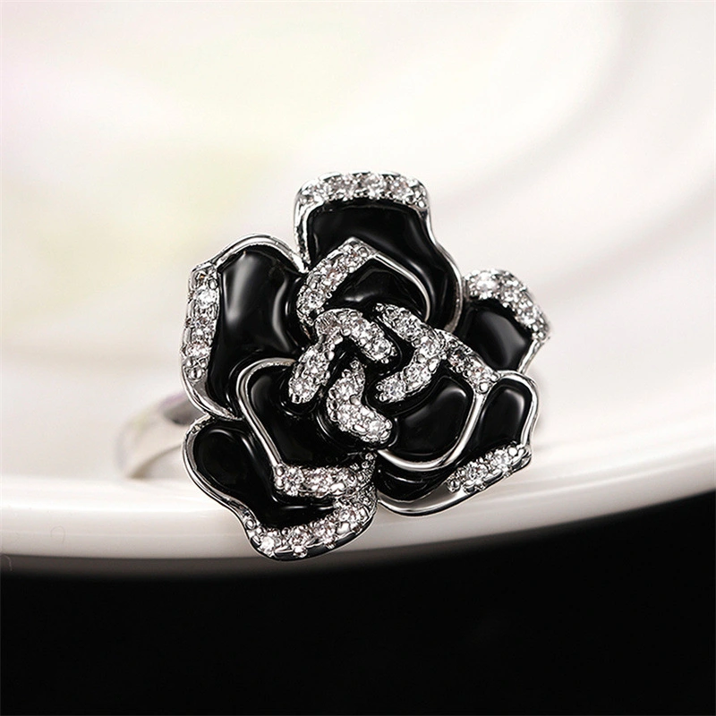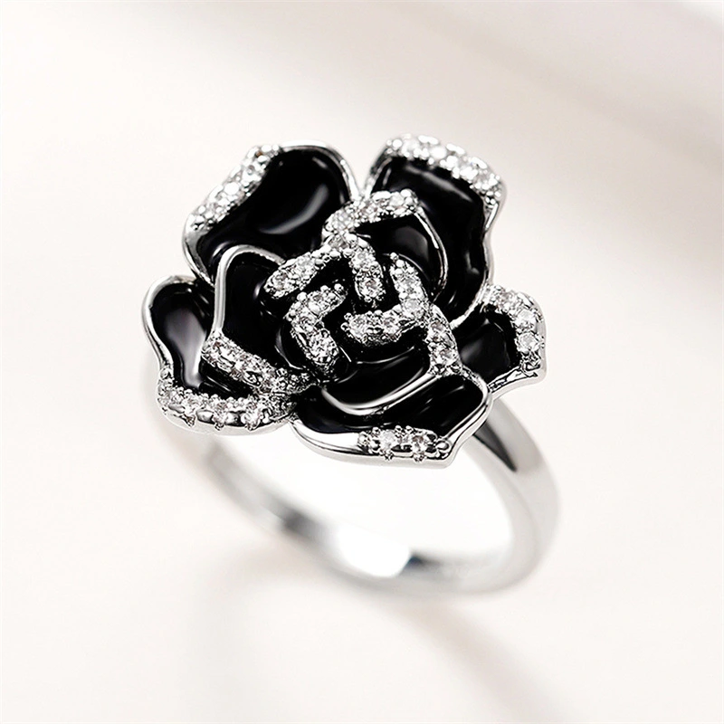 خاتم نسائي أنيق من المينا بتصميم عتيق مصنوع من الزركون وزهرة الورد السوداء الفريدة من نوعها، خاتم غراء مصنوع يدويًا للنساء
