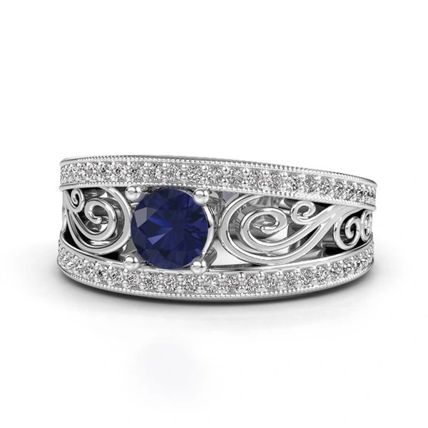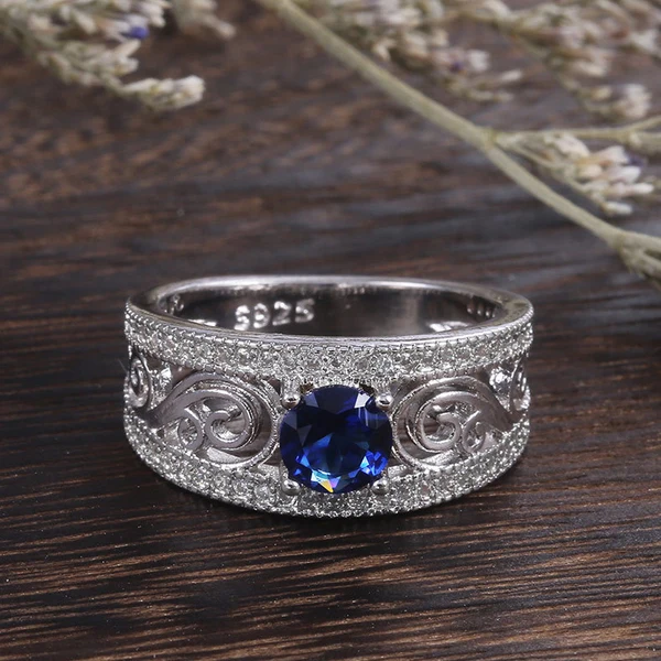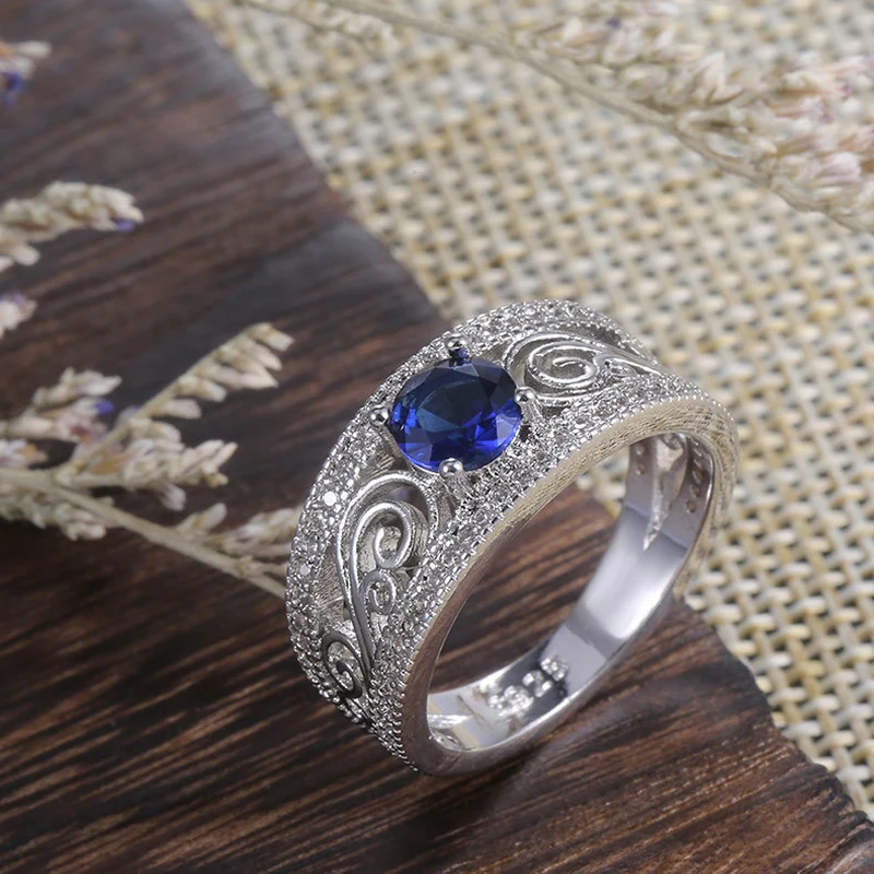 خاتم نسائي أوروبي وأمريكي جديد فاخر مرصع بالزركون الأزرق على شكل زهرة مجوفة خاتم حفلات أنيق