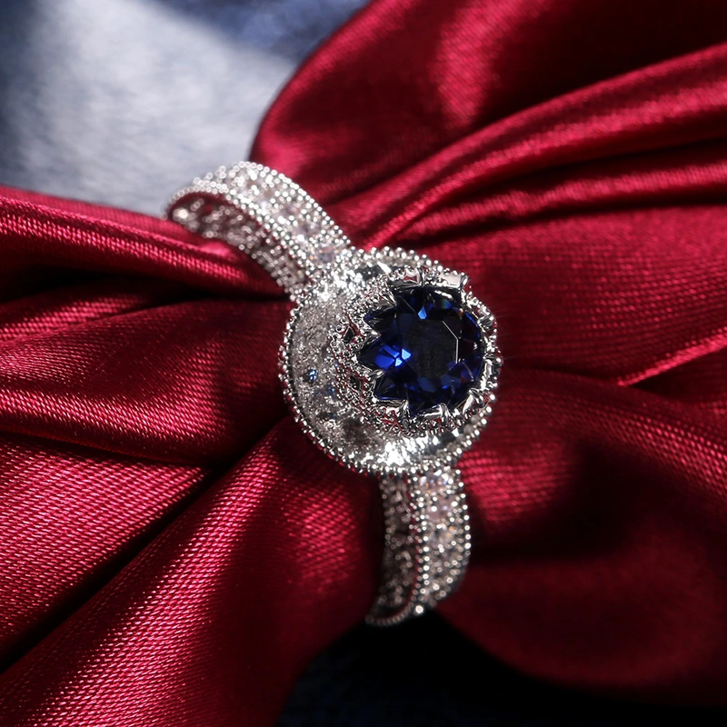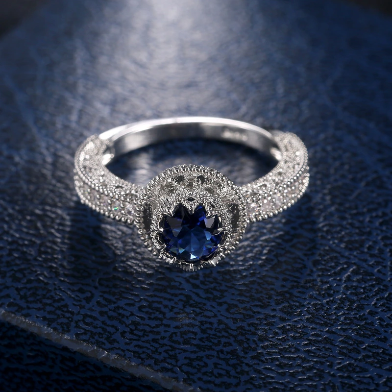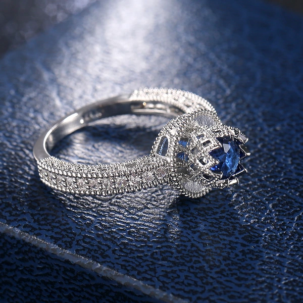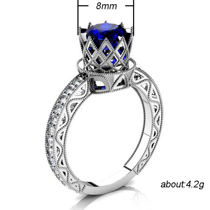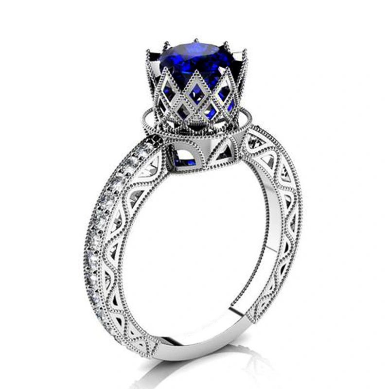 خاتم نسائي أوروبي وأمريكي رائج البيع بتصميم جديد مجوف منحوت مرصع بأحجار كريمة زرقاء على شكل تاج على طراز القصر الأوروبي