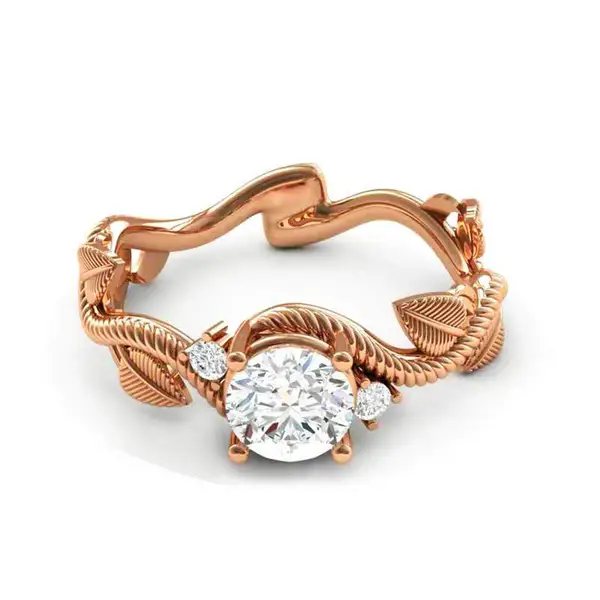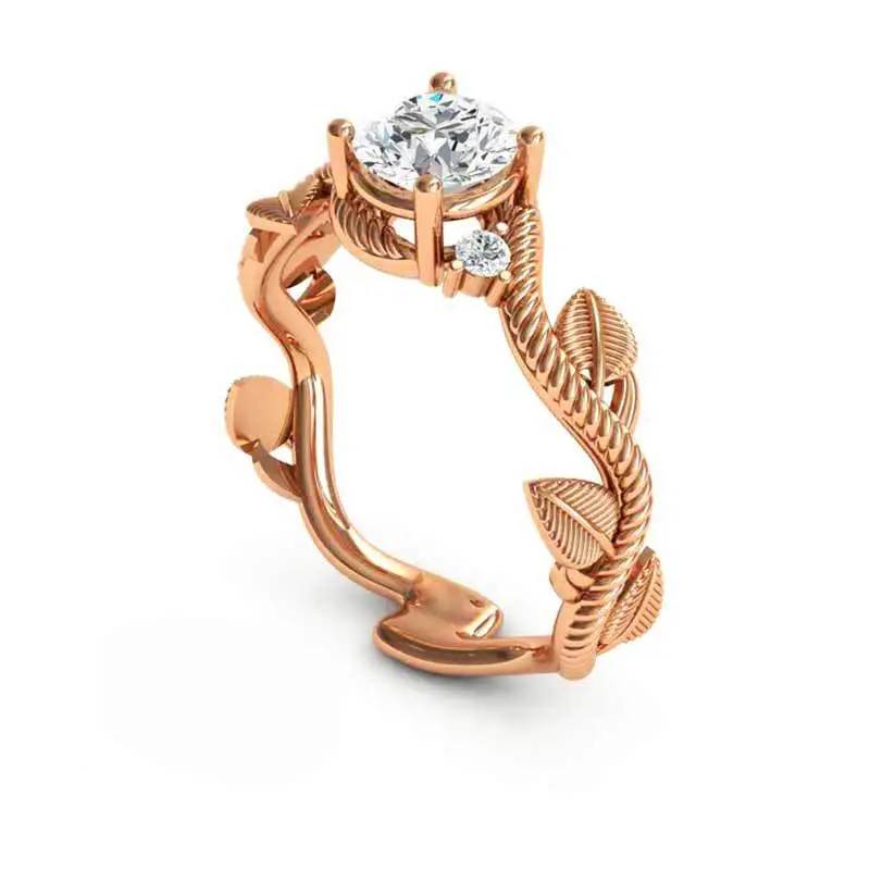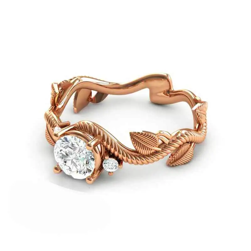 خاتم نسائي جديد على شكل ورقة كرمة من الألماس والزركون مطلي بالنحاس والذهب الوردي على شكل زهرة وردية اللون