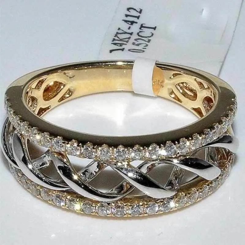 خاتم كلاسيكي مرصع بأحجار الزركون المقلد بأربعة مخالب للنساء، خاتم ذراع ملتوي مزدوج اللون، خاتم خطوبة وزواج للنساء