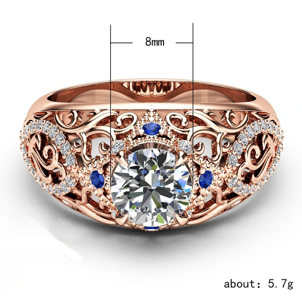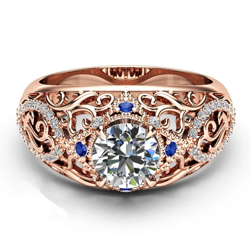 خاتم نسائي فاخر جديد من الذهب الوردي على شكل زهرة مجوفة مرصعة بالزركون والأحجار الكريمة الزرقاء من أوروبا وأمريكا