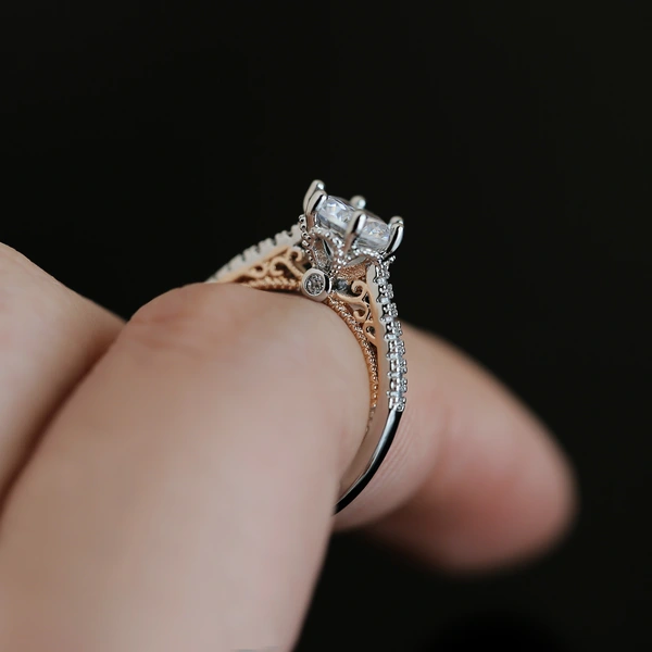 خاتم كلاسيكي مرصع بأحجار الزركون المقلد بأربعة مخالب للنساء، خاتم ذراع ملتوي مزدوج اللون، خاتم خطوبة وزواج للنساء