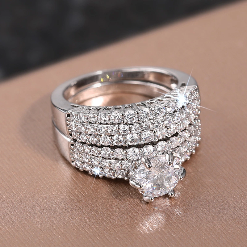 زوج من خواتم الزركون الفاخرة الخفيفة المرصعة بالكريستال للنساء للخطوبة والزفاف والمجوهرات المطابقة العصرية اللامعة المكونة من قطعتين