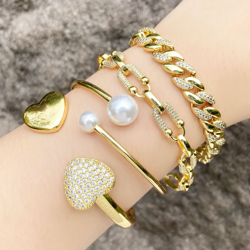 كسوار مجوهرات أوروبية وأمريكية راقية من اللؤلؤ على شكل قلب سوار نسائي مطلي بالنحاس عيار 18 قيراطًا من الذهب والمجوهرات اليدوية brk17