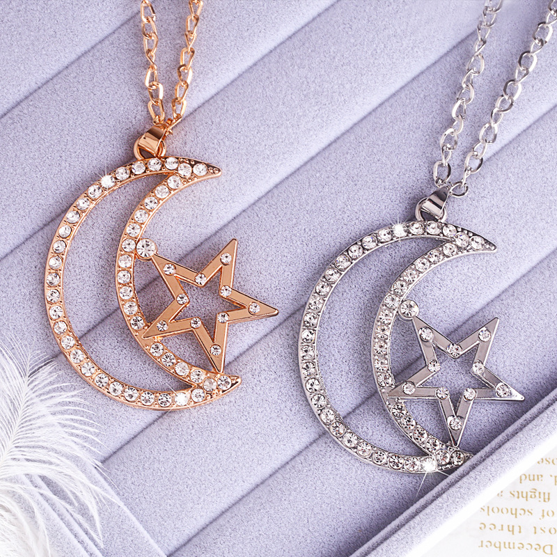 سلسلة سترة كورية أنيقة رائعة للنساء قلادة على شكل نجمة وقمر عالية الجودة قلادة من سبائك حجر الراين nkn25