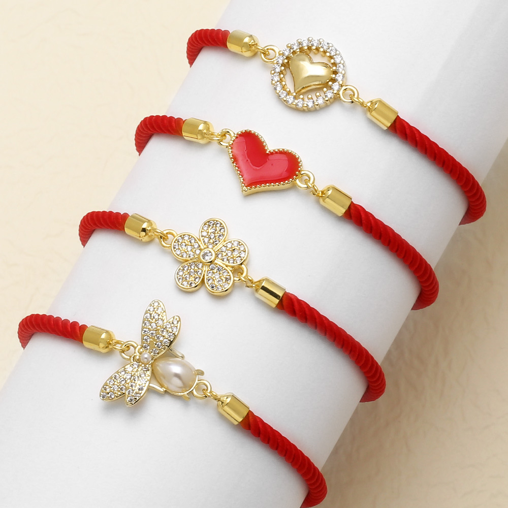 سوار مطلي بالذهب قابل للتعديل على شكل قلب خوخ وزهرة وحبل أحمر من المجوهرات الأوروبية والأمريكية brg65