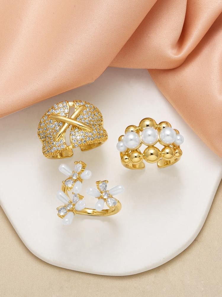 AS jewelry European and American pearl flower full zircon ring female high-grade copper plated 18k gold open ring riq85