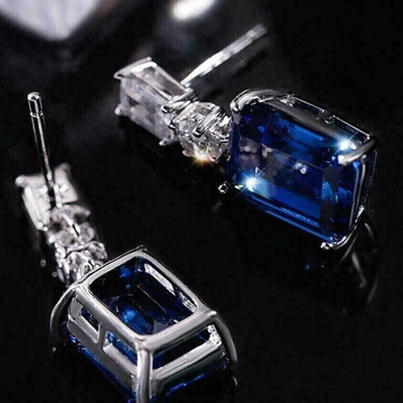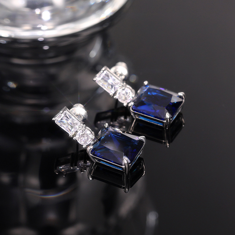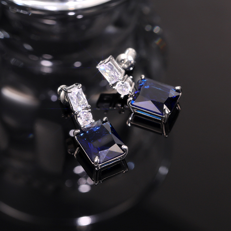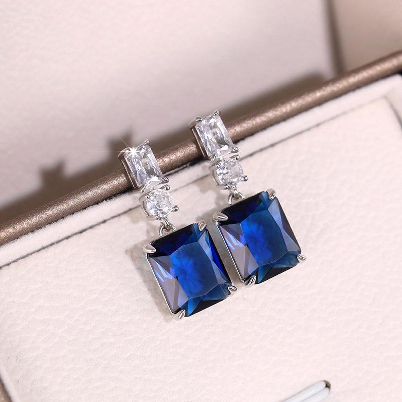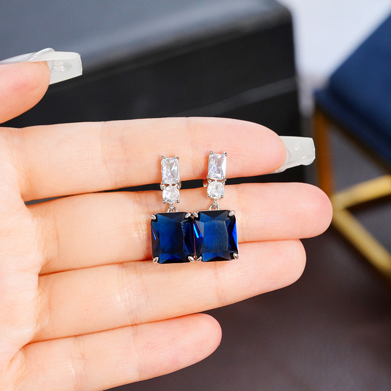 Best-selling rectangular earrings with blue contrast zircon, fashionable and versatile evening bridal earrings