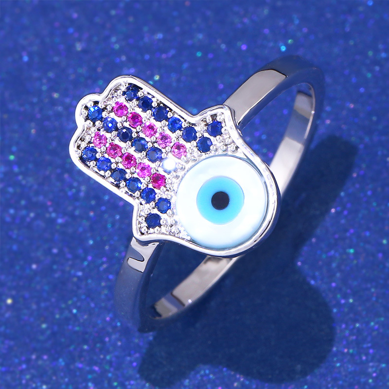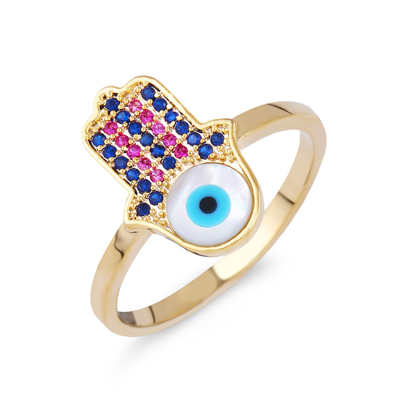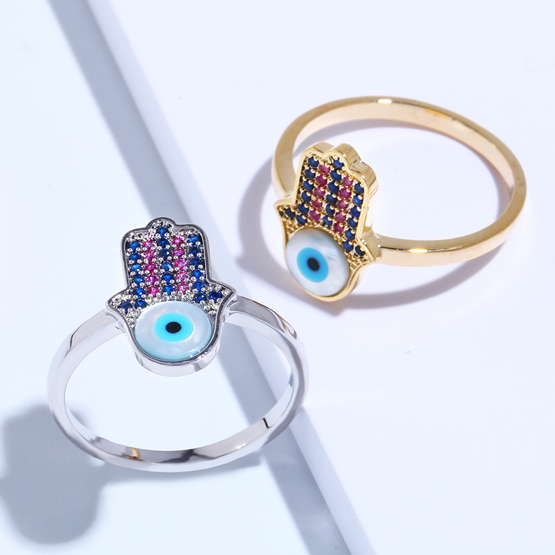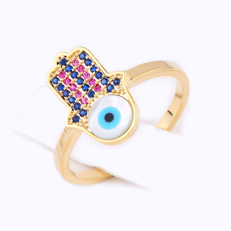 Clearance sale Turkish blue devil eye ring copper inlaid stone shell Fatima hand jewelry rie76
