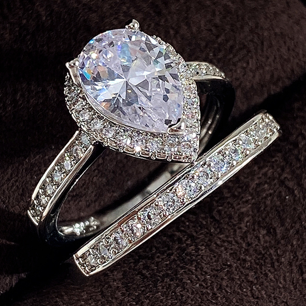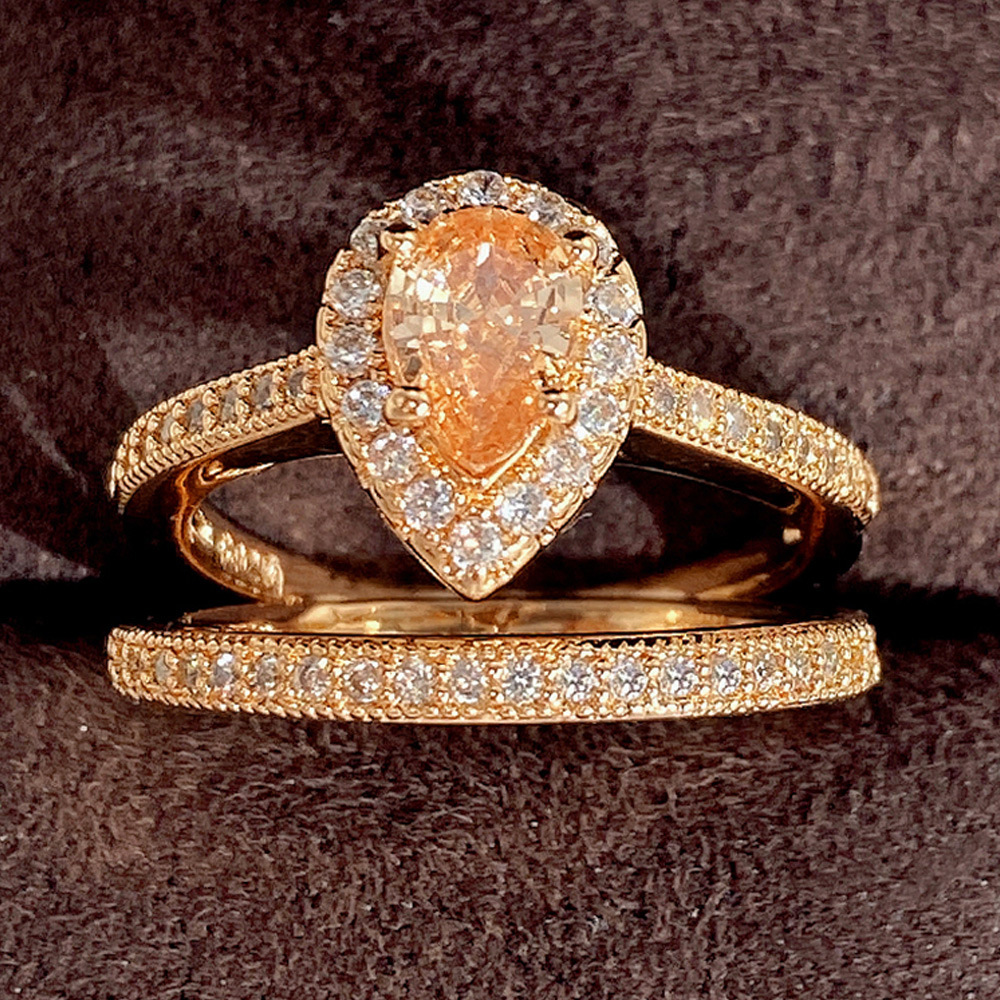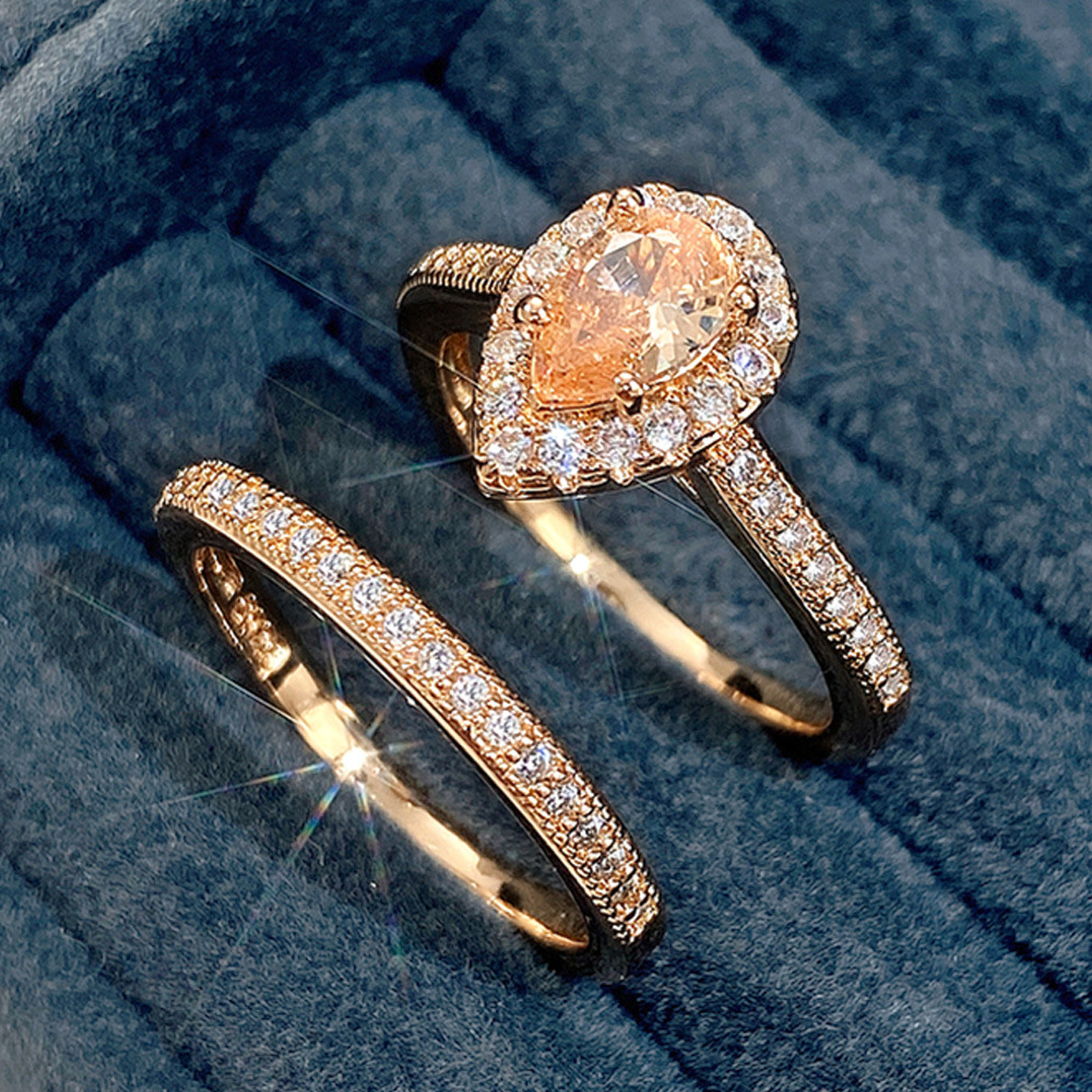 Copper plated champagne gold ring set hot sale women's ring single row micro inlaid water drop zircon combination ring accessories
