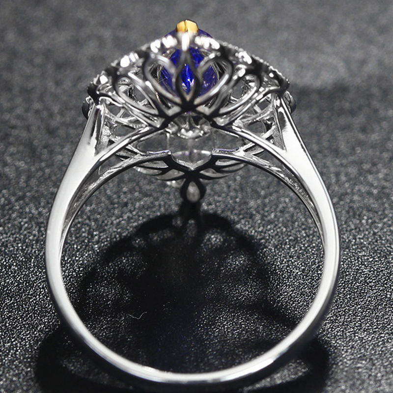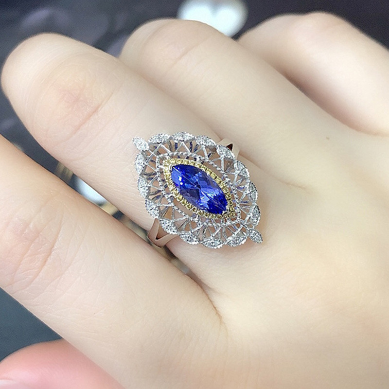 Designer imitation Tanzanite female ring horse eye hollow luxury palace style plated two-color gemstone ring female