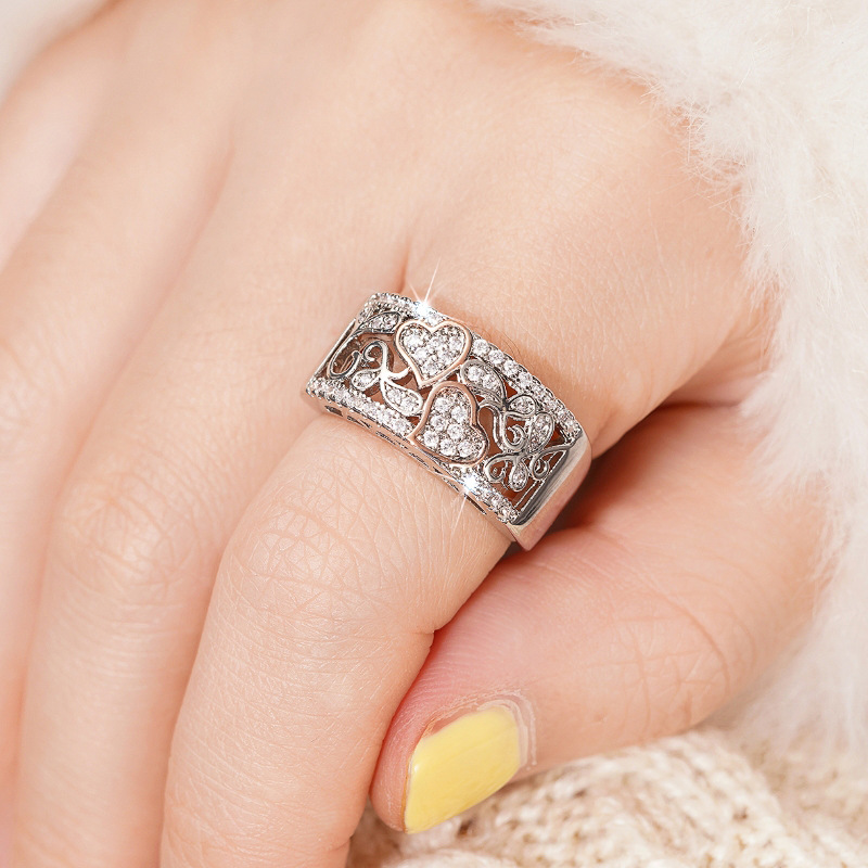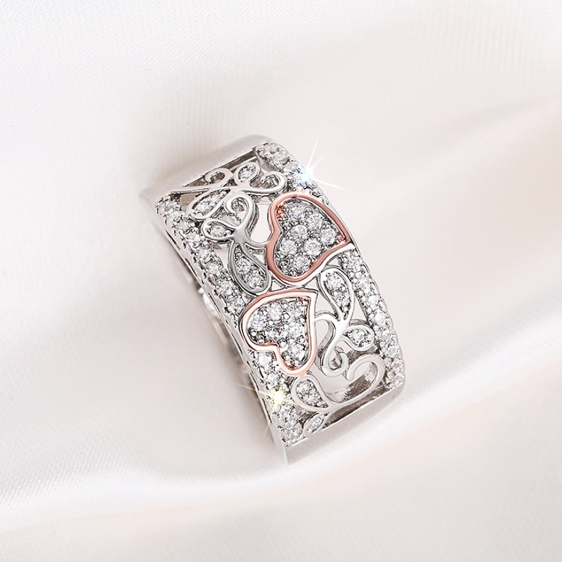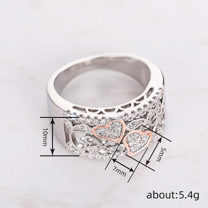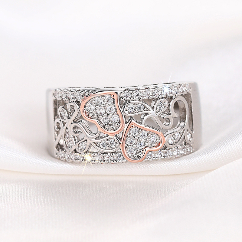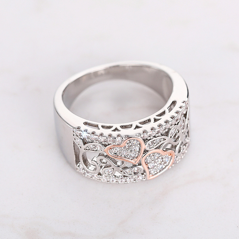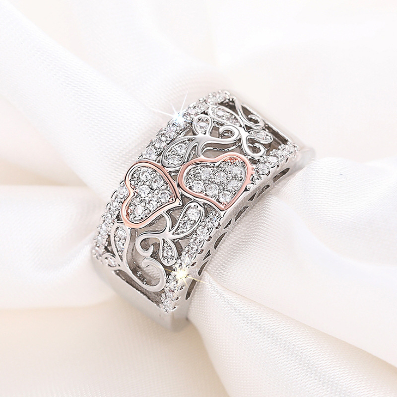 Electroplated two-tone ring for women, rose gold heart-shaped ring, sweet and fashionable zircon jewelry