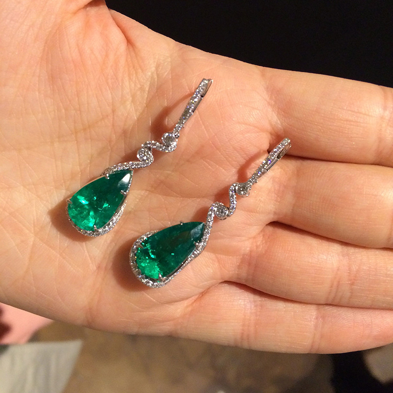 Emerald long earrings with twisted design, teardrop-shaped zircon inlaid exquisite banquet earrings