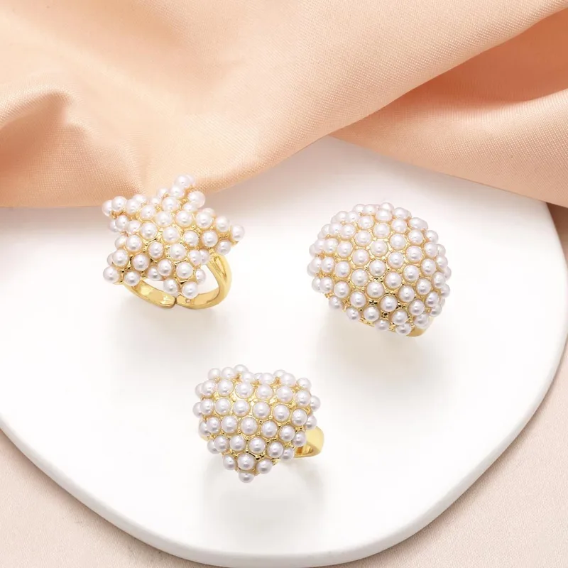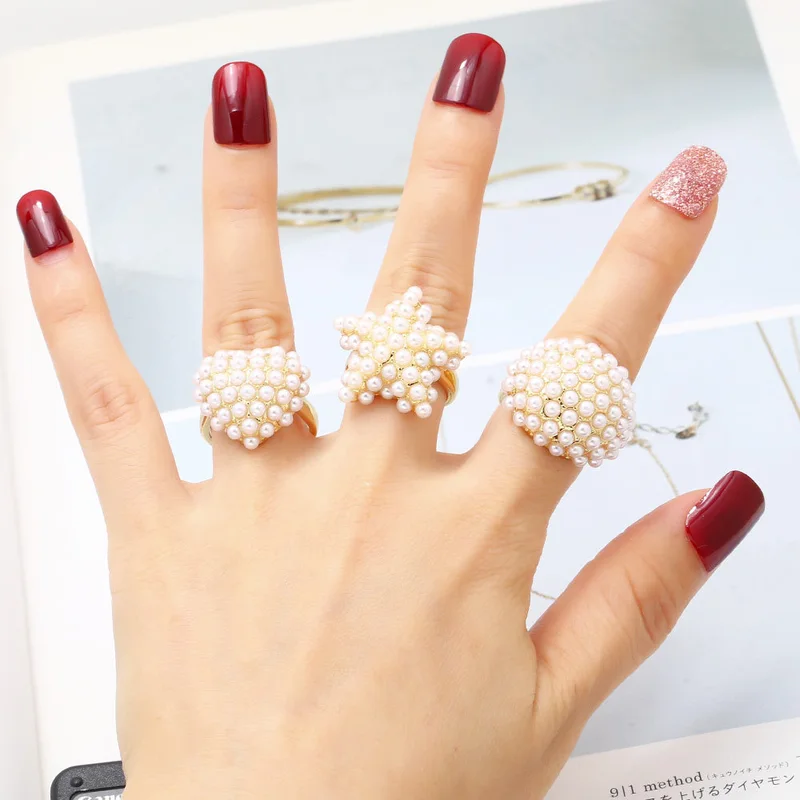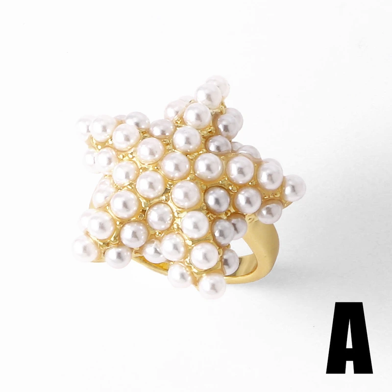 Anillo de amor con estrella de cinco puntas y perla europea y americana, chapado en oro, redondo y abierto, rih46