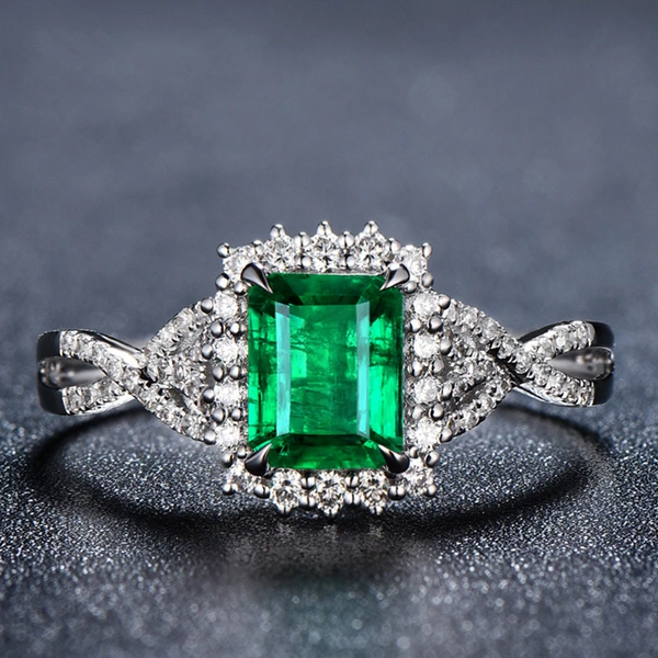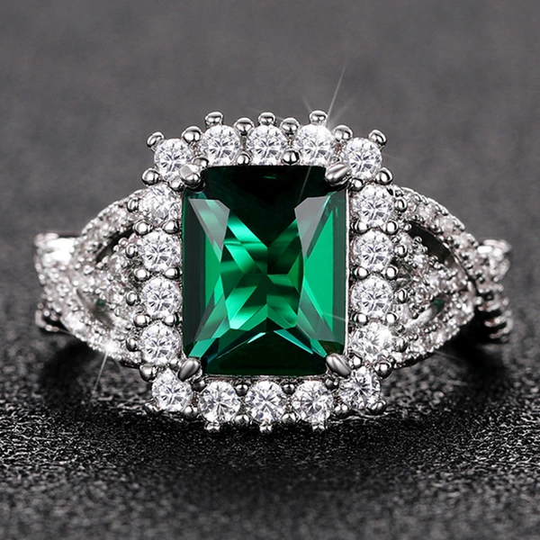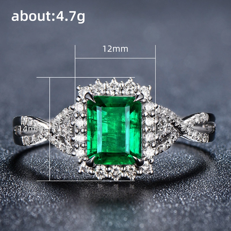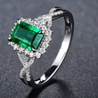 Anillo de lujo con circonita cuadrada verde esmeralda para mujer, chapado en oro blanco.