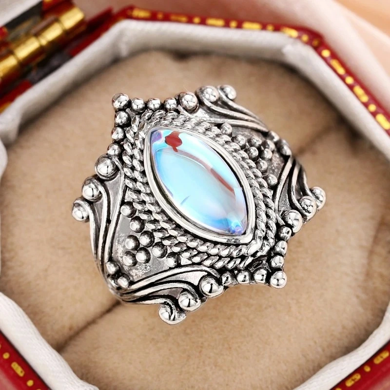 Anillo de marquesa de moda de gran venta para mujer, imitación de piedra lunar, joyería estilo Nepal, anillo de estilo retro.