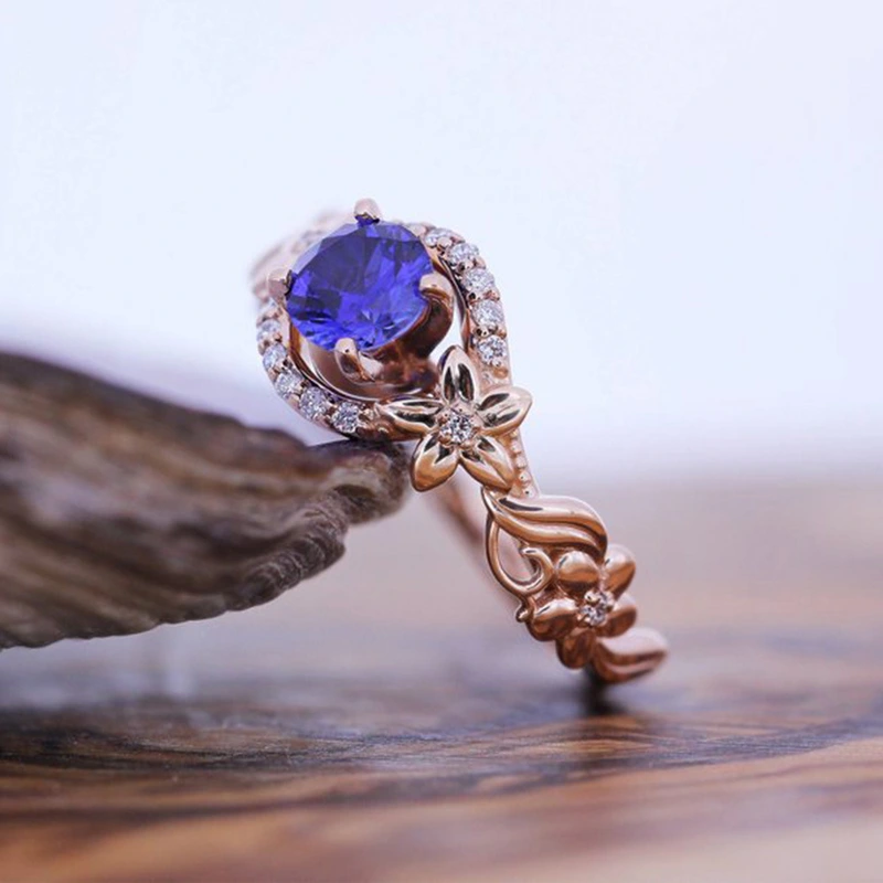 Anillo de mujer con circonita azul real y incrustaciones de flores de oro rosa, joyería europea y americana.