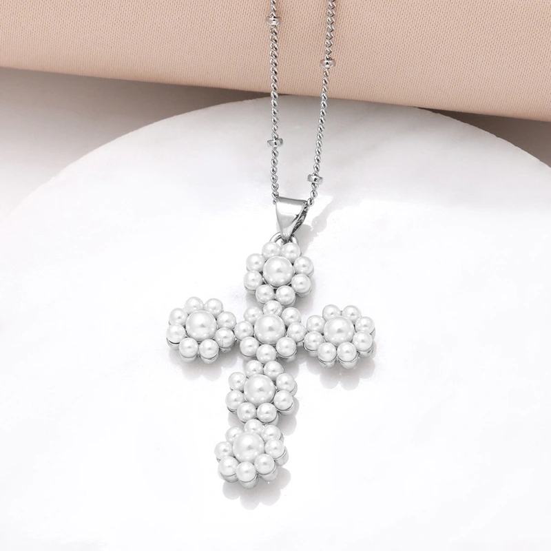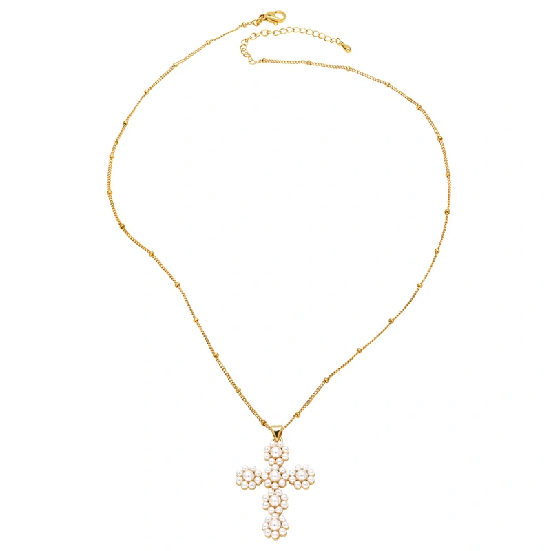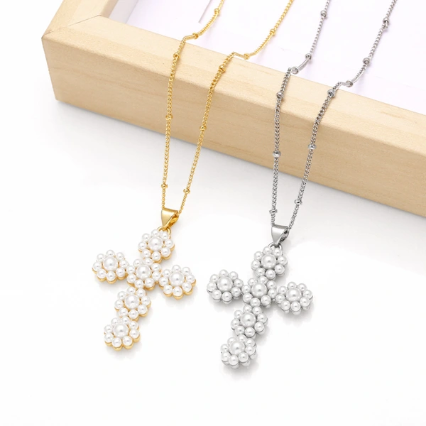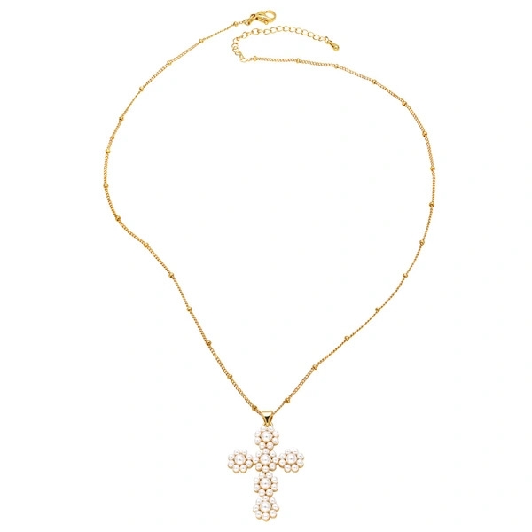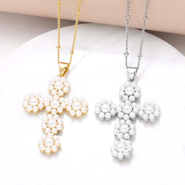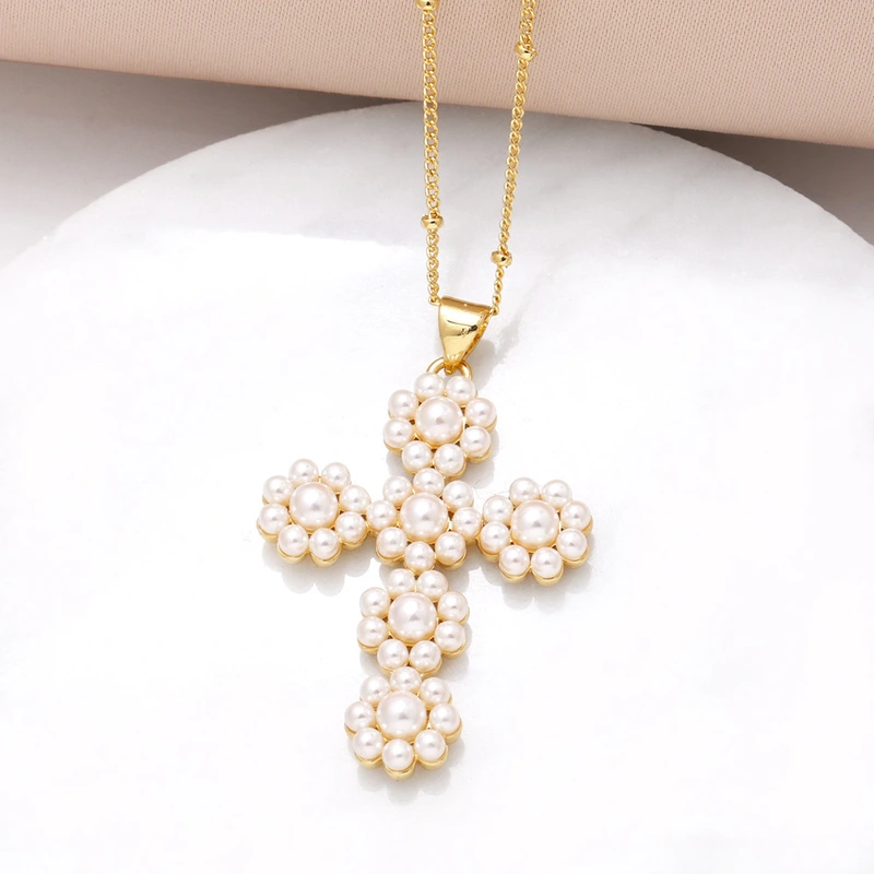 Collar con colgante de cruz de perla, joyería femenina, chapado en cobre, cadena de clavícula de oro auténtico, nkq08