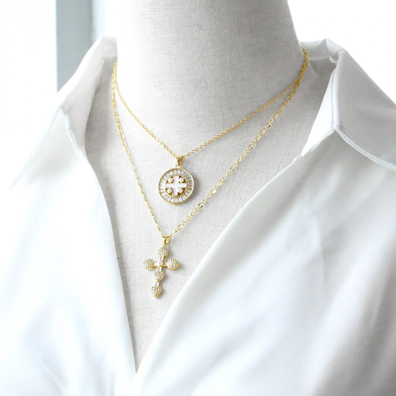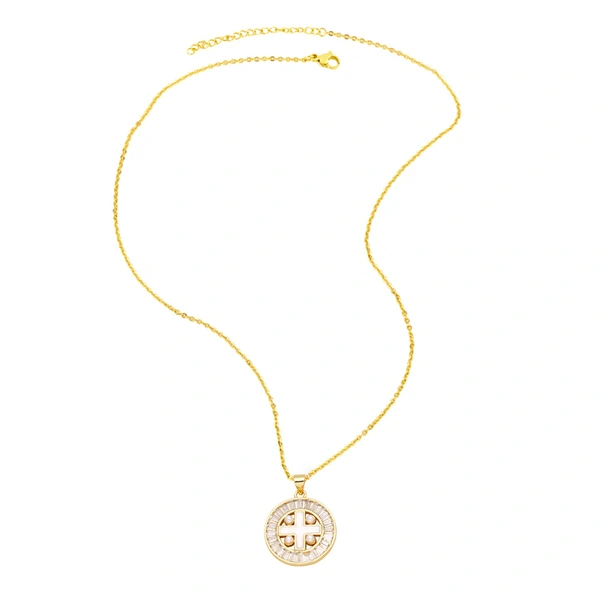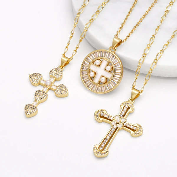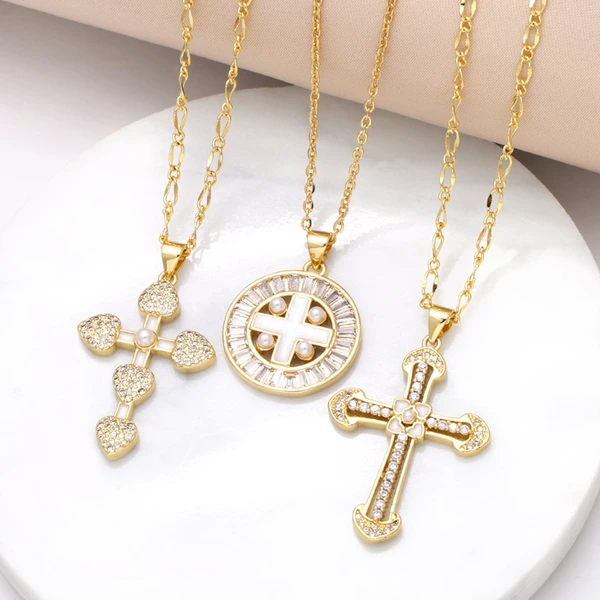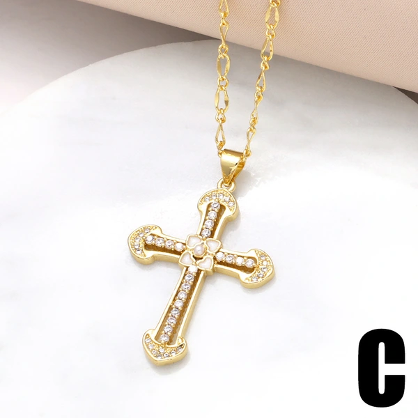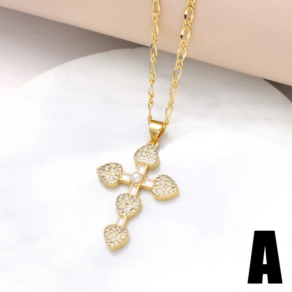Collar con cruz de amor, lleno de circonitas, chapado en cobre y cadena de clavícula en oro de 18 quilates (NKR33).