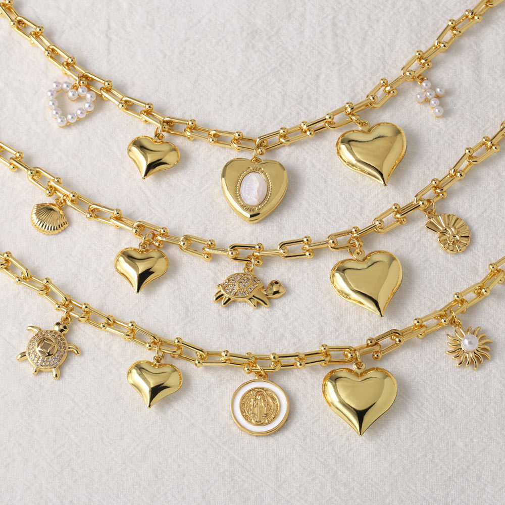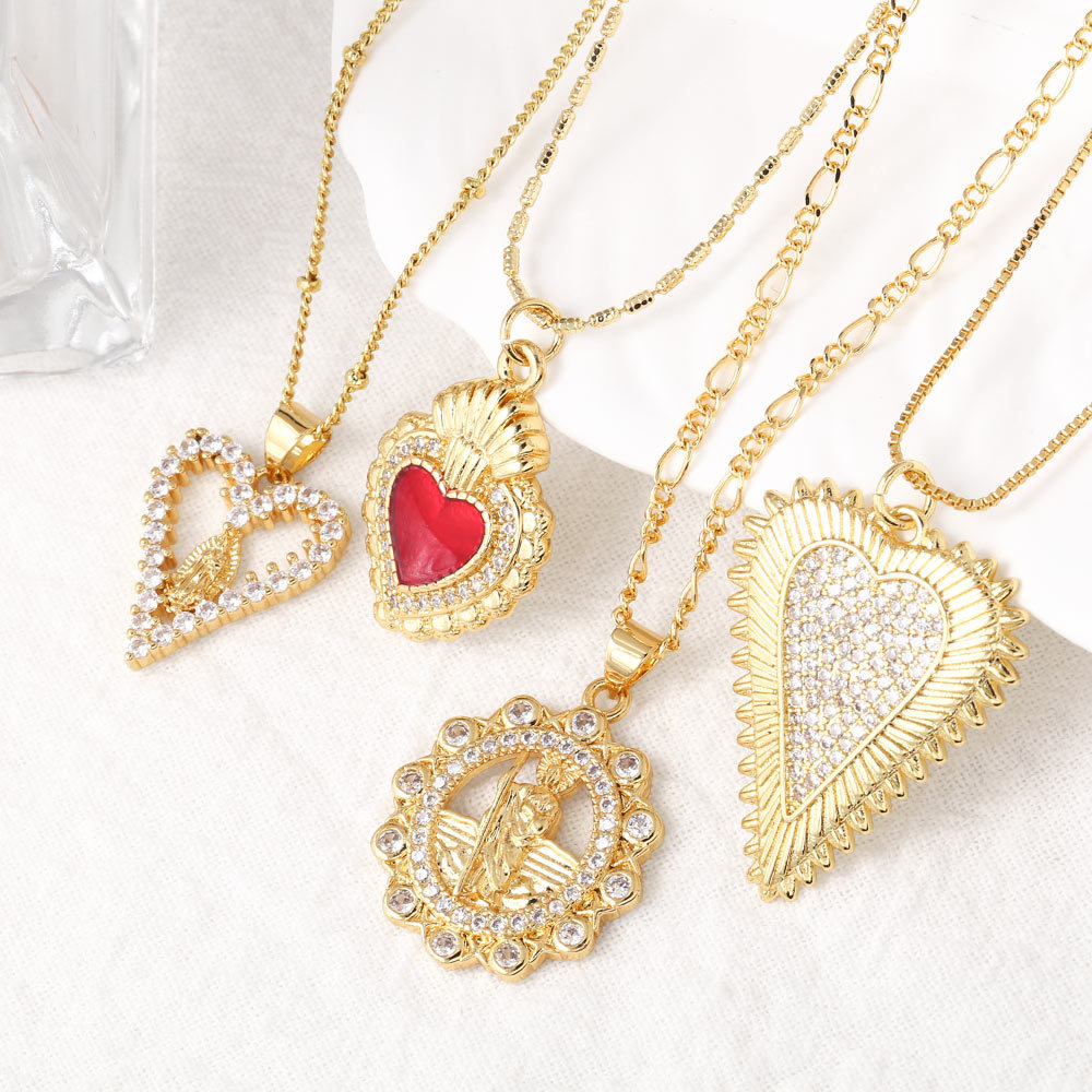 Liquidación de joyas europeas y americanas, colgante de corazón de melocotón con la Virgen María, chapado en oro brillante, collar en forma de U, cadena de clavícula para mujer NKU22
