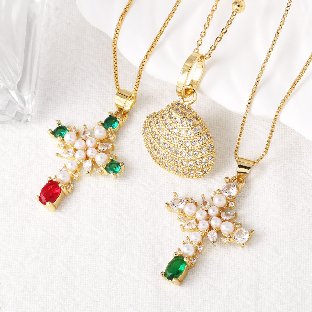 Collar con colgante de cruz de circonita cúbica chapado en oro para mujer, joyería de gran venta, nkq75