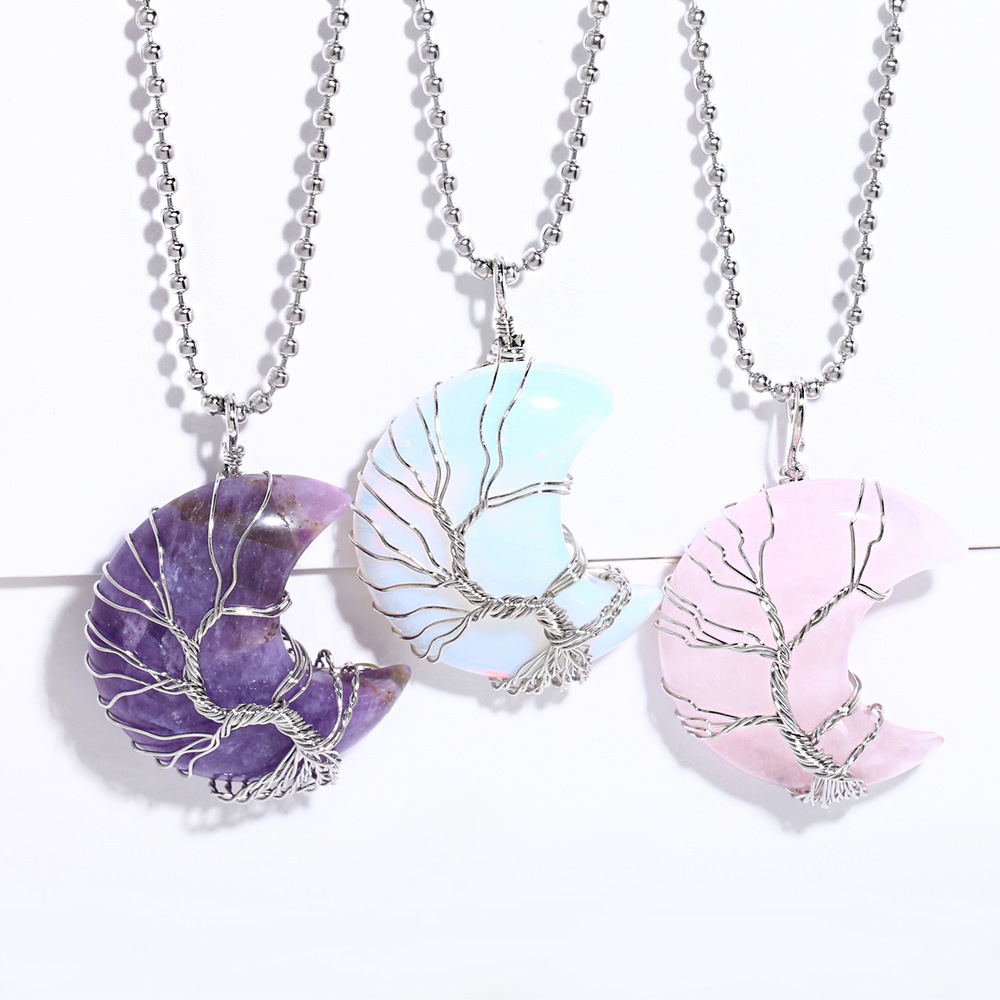 Collar con colgante de luna de ágata de cristal envuelto alrededor del árbol de la vida, hecho a mano, con árbol de la fortuna, NKB616