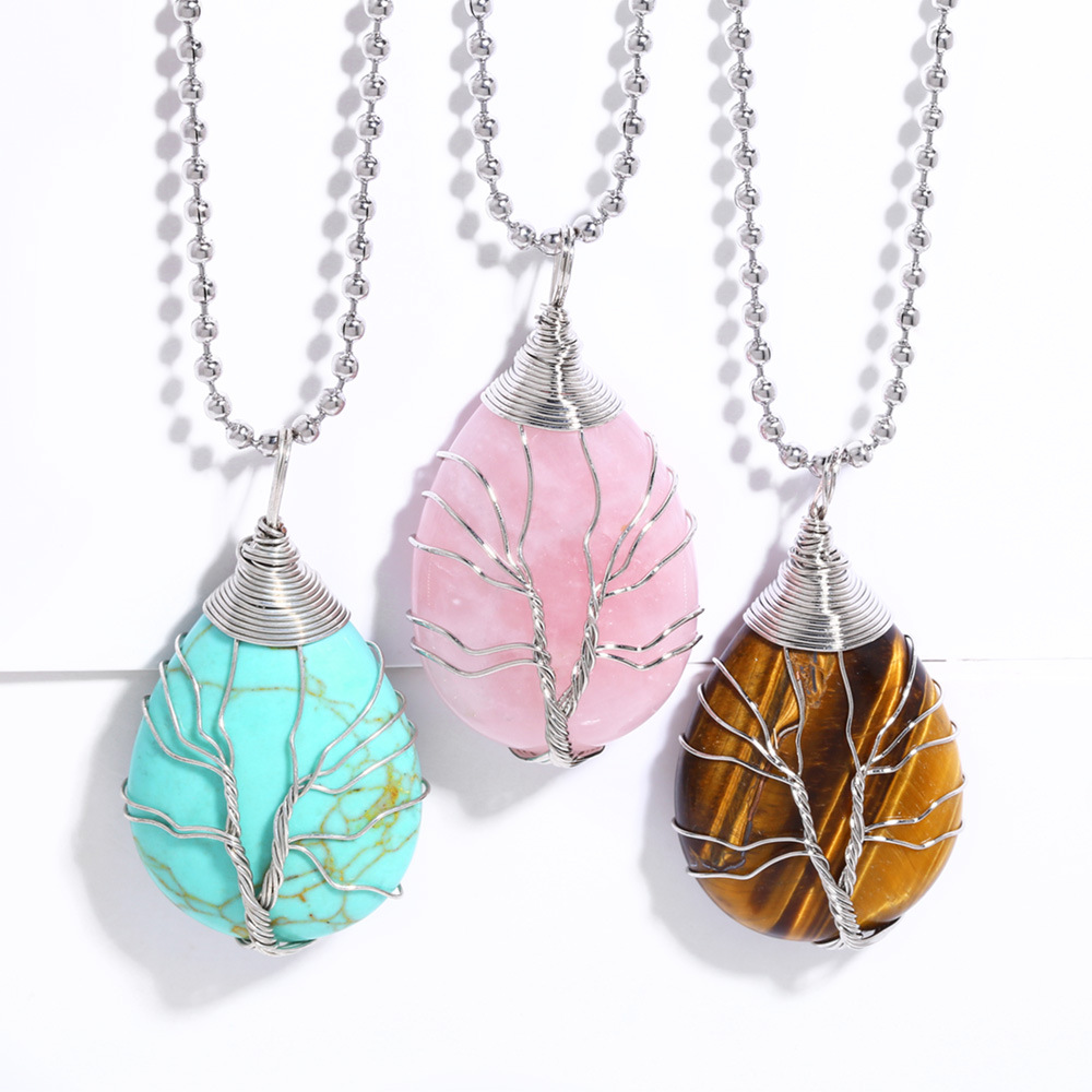 Collar con forma de lágrima, colgante de árbol de la vida, amatista, turquesa y ágata (NKB637)
