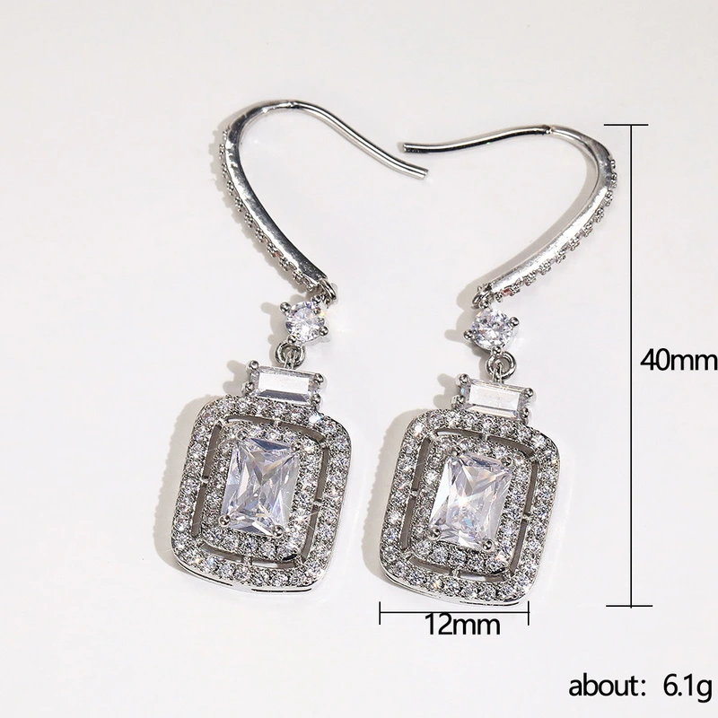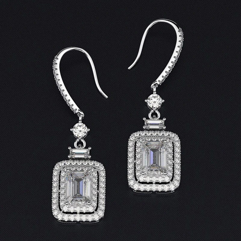 Nuevos pendientes de platino con circonitas y diamantes de princesa, ganchos para las orejas, pendientes de lujo con incrustaciones de racimo para mujer