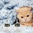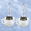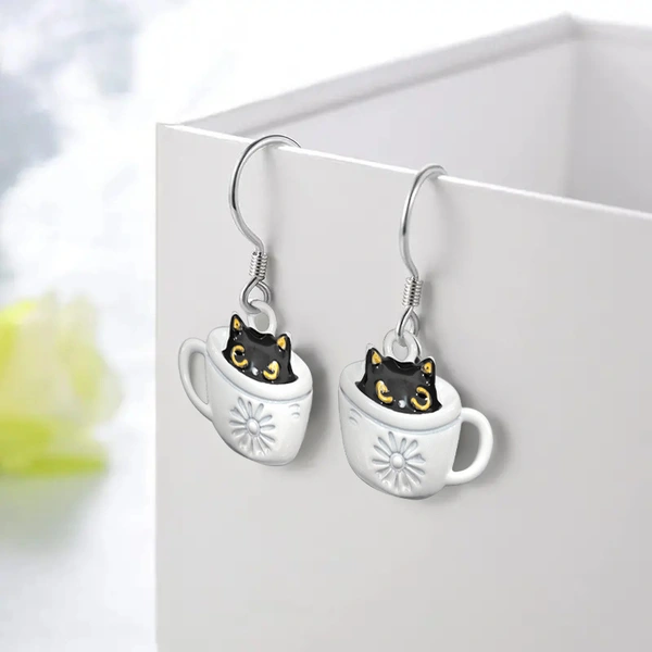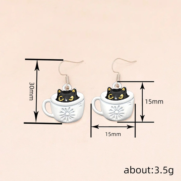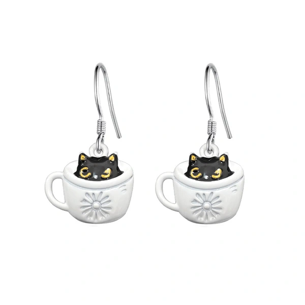 Pendientes bonitos y muy populares para mujer, con diseño de gato y café, accesorios esenciales para un atuendo dulce.
