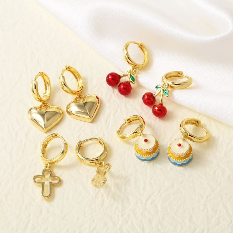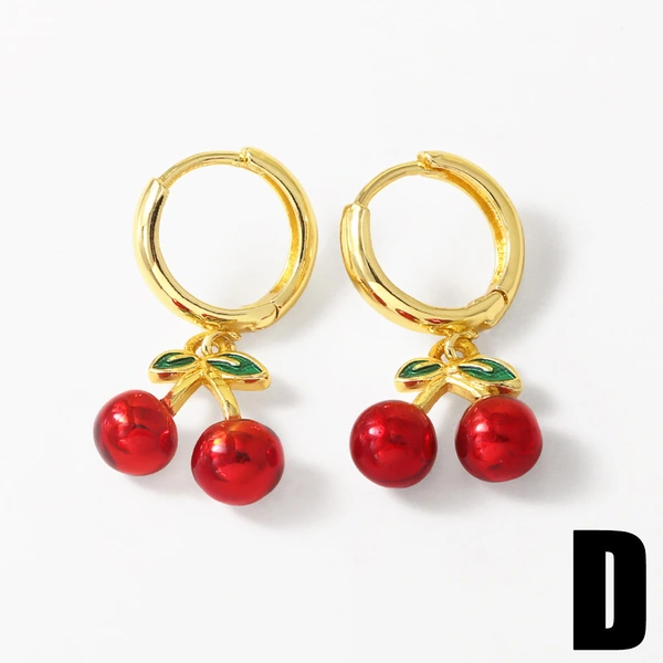 Pendientes de oro auténtico chapados en cobre con forma de cruz, fruta y cereza, estilo europeo y americano, para mujer, ERZ78