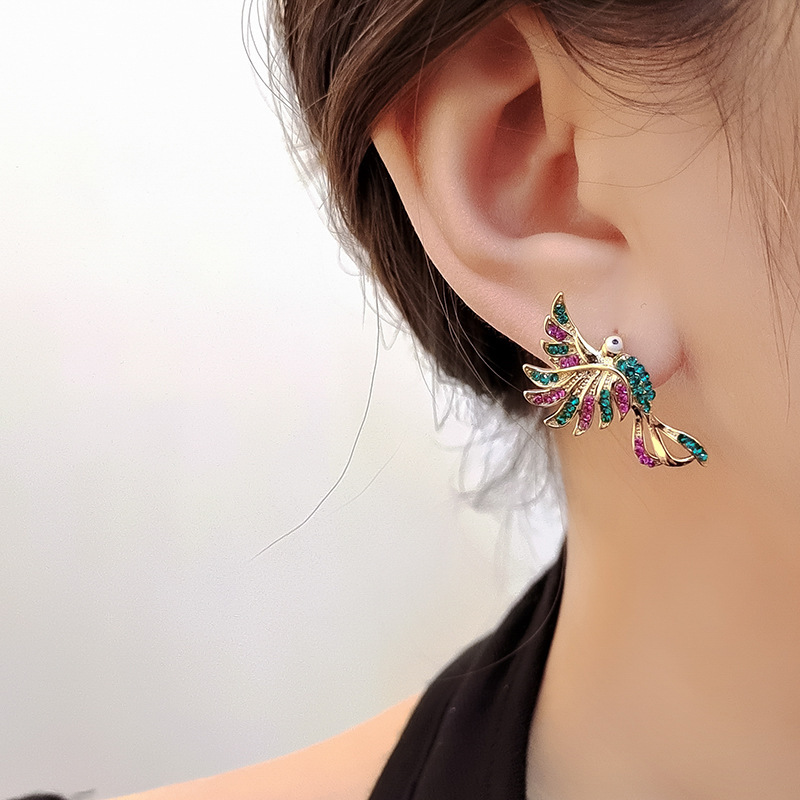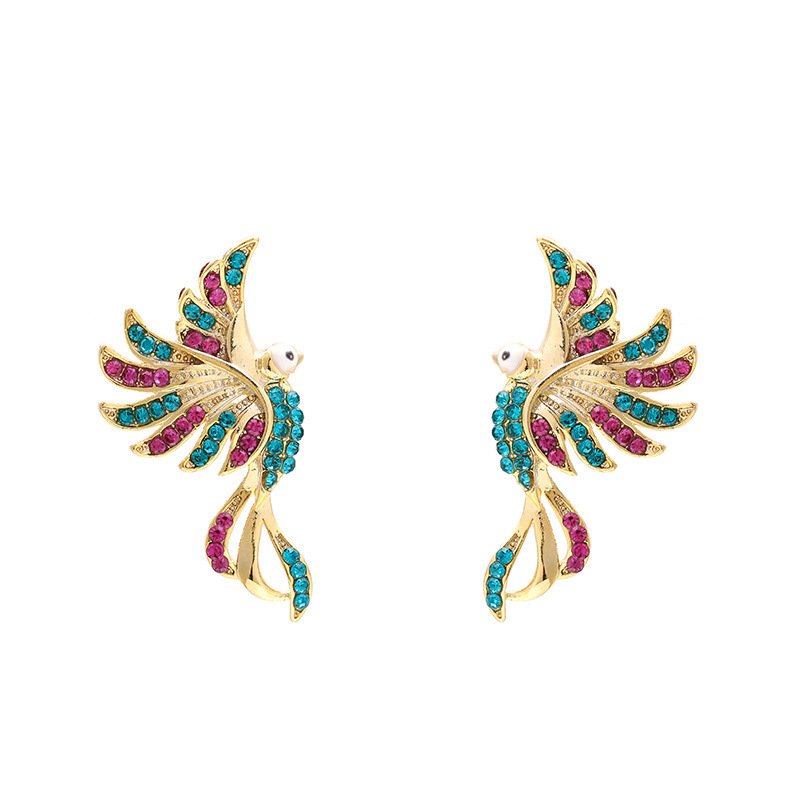 Ethnic style colorful auspicious bird earrings for women, fashionable and elegant temperament jewelry, micro-inlaid metal oil drop