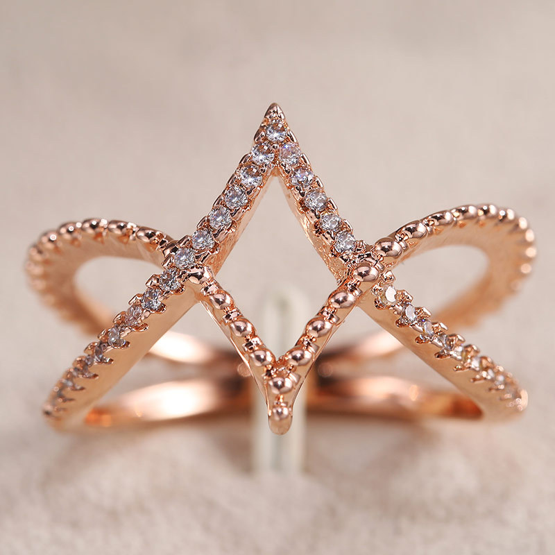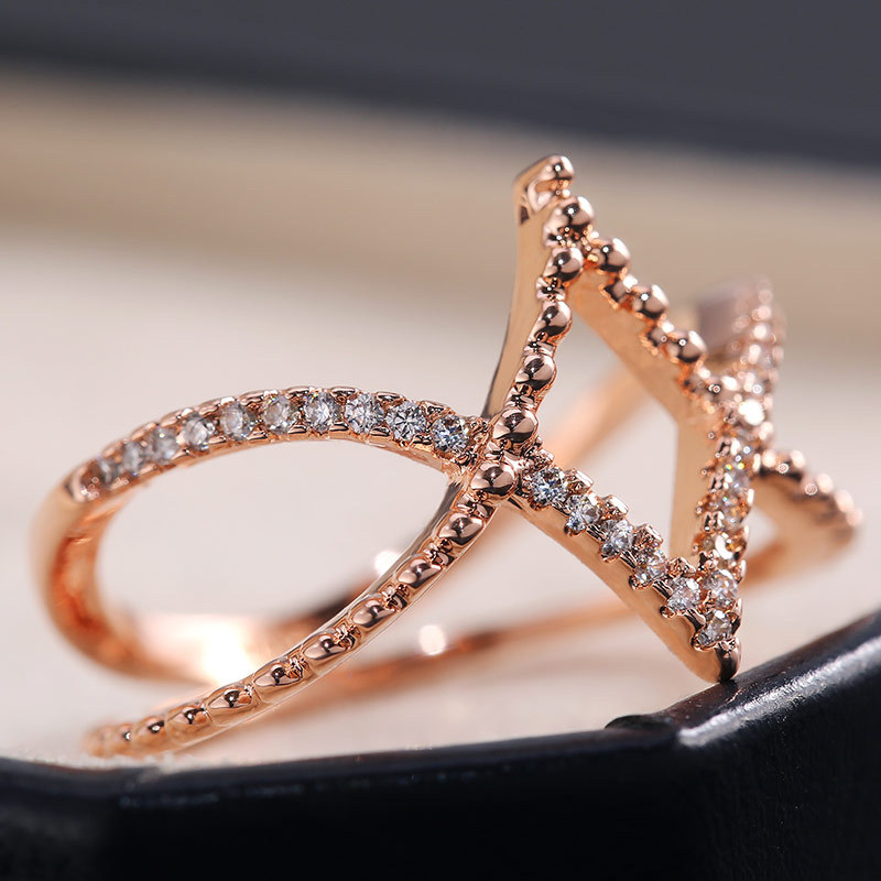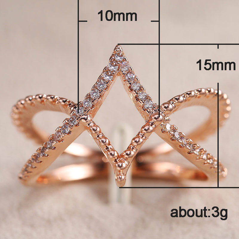 European and American creative rose gold diamond diamond line ring V-shaped cross ring jewelry