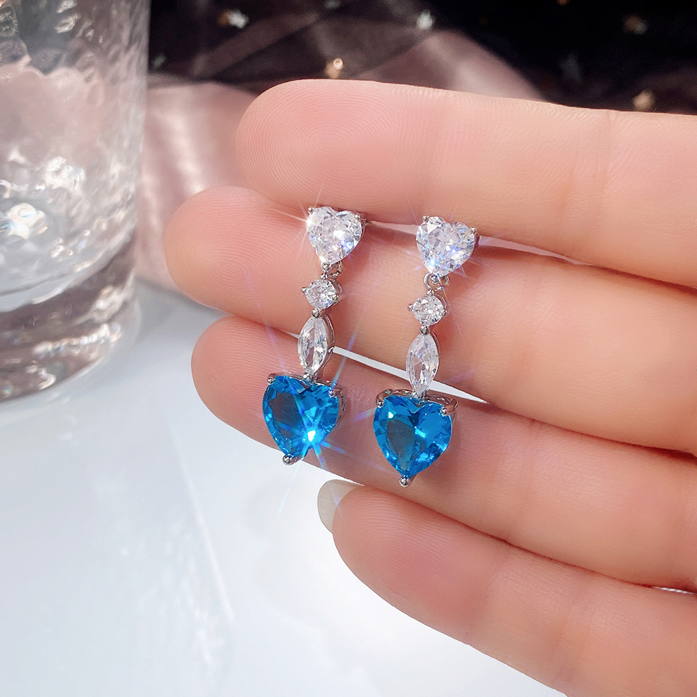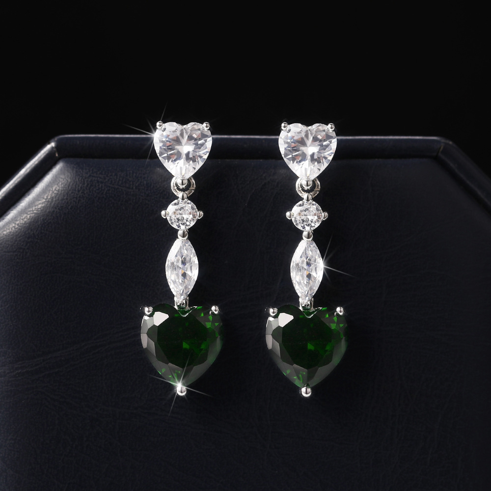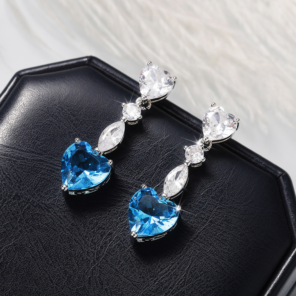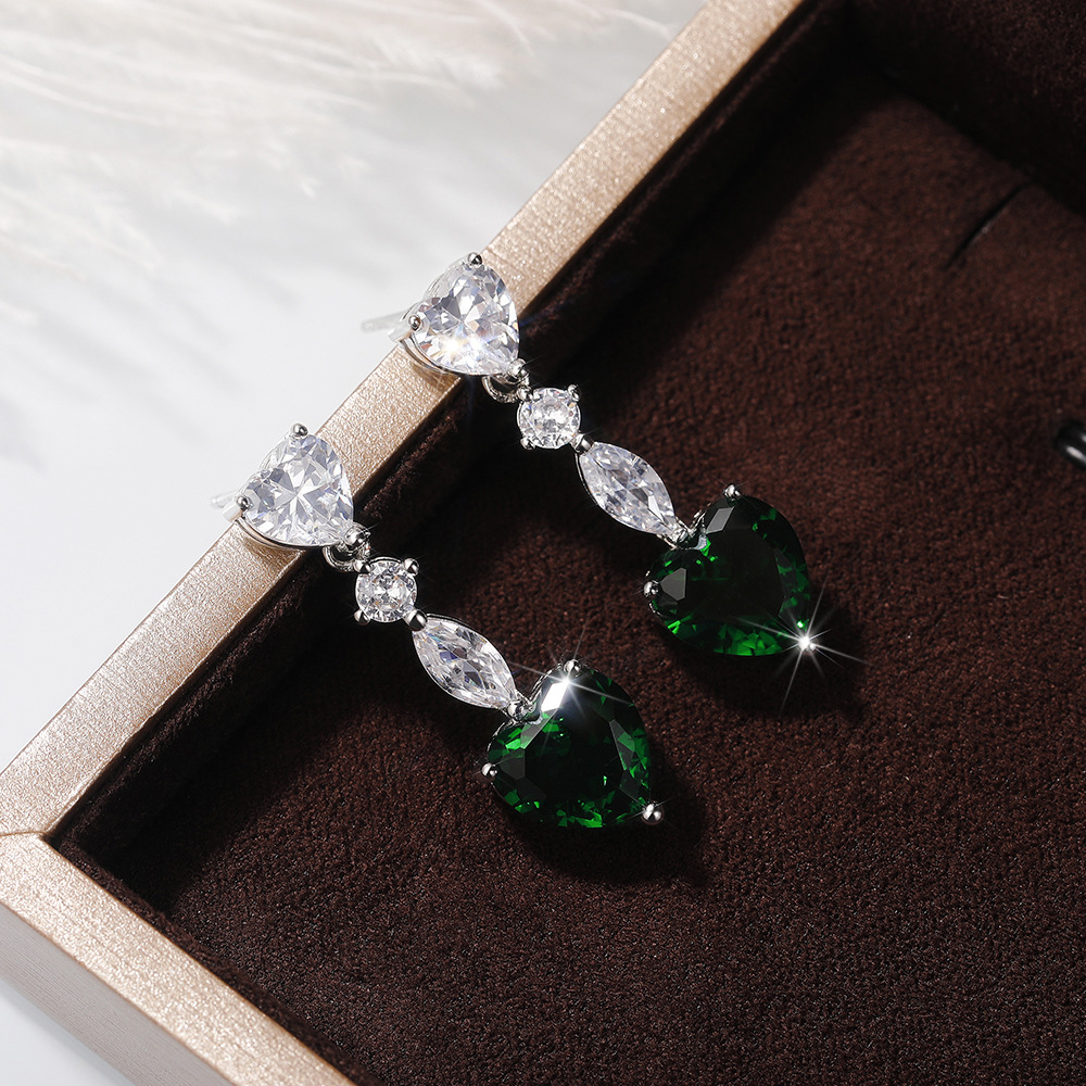 European and American high-end new emerald zircon peach heart earrings inlaid with sea blue heart high-end earrings for women