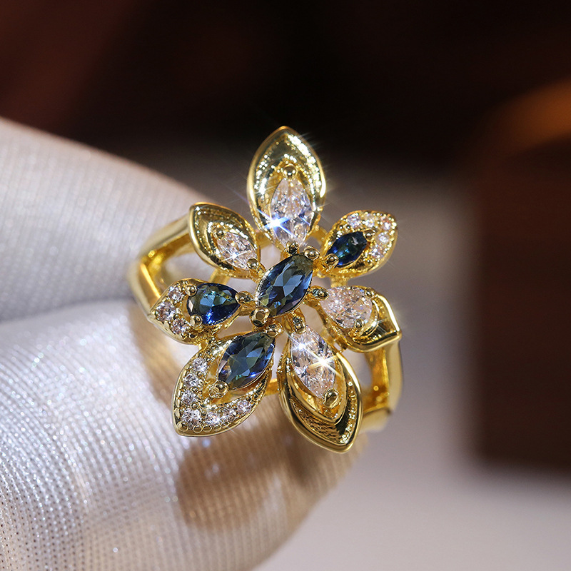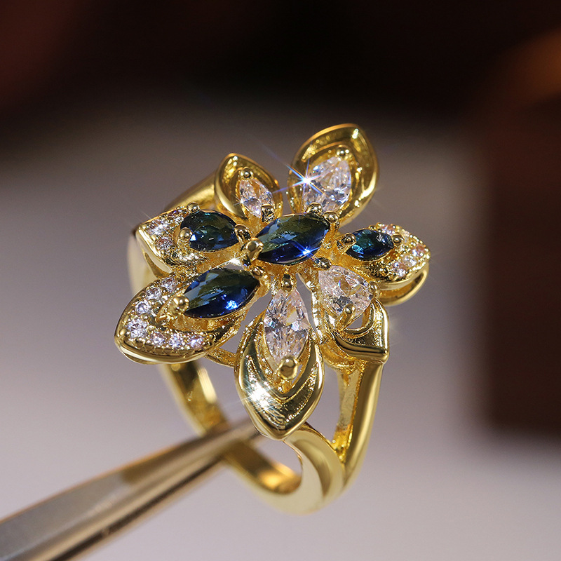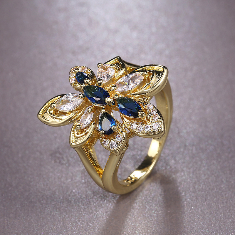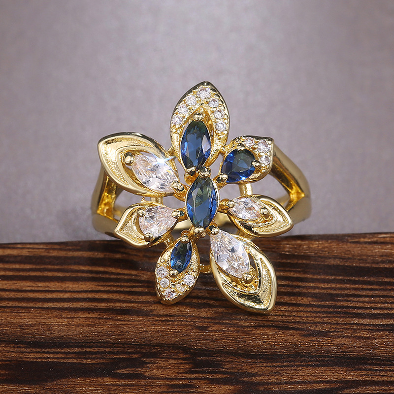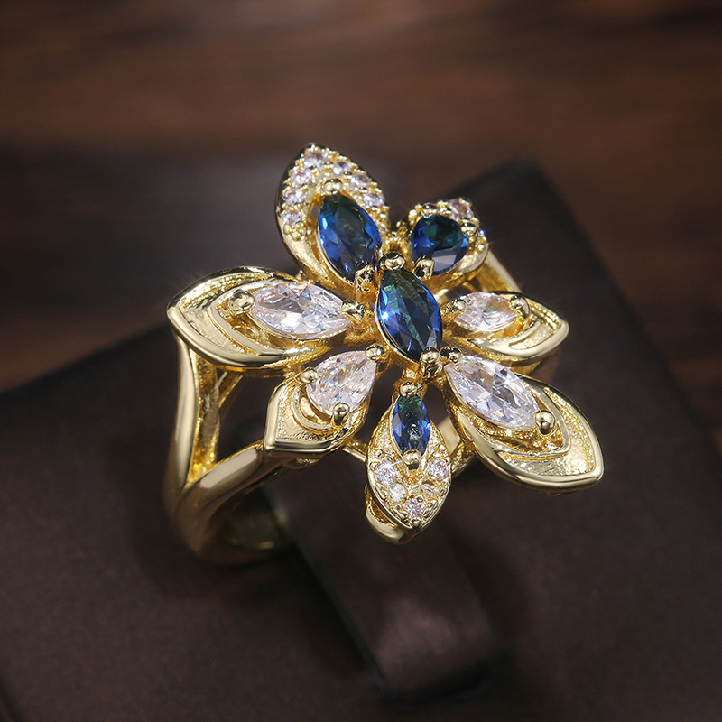 European and American hot-selling luxury atmospheric women's flower-shaped colored zircon ring party ring jewelry