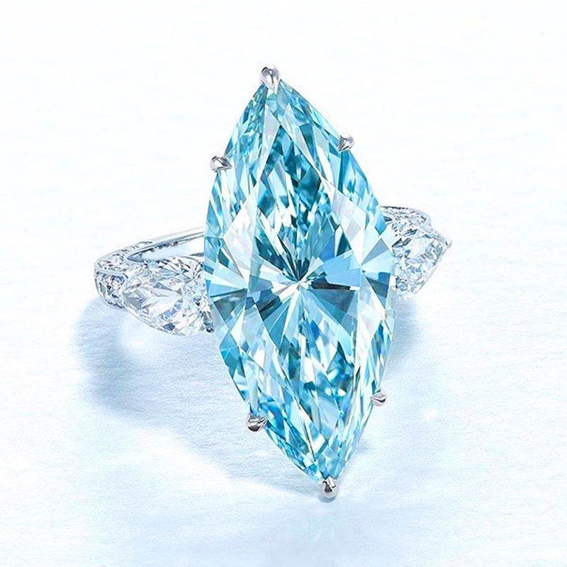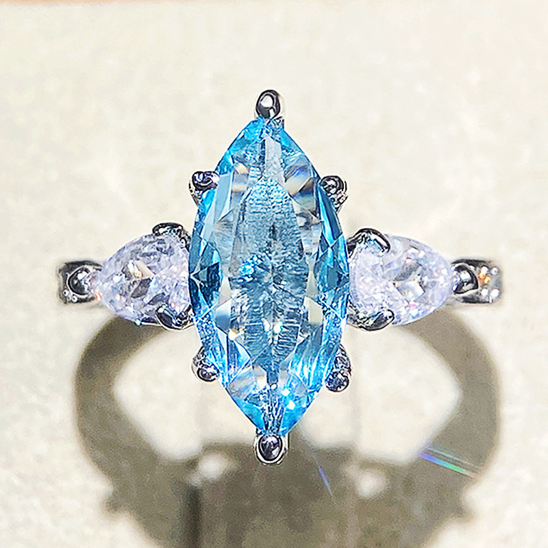 European and American jewelry copper inlaid light blue marquise-shaped zircon wedding ring women's wedding jewelry hand jewelry