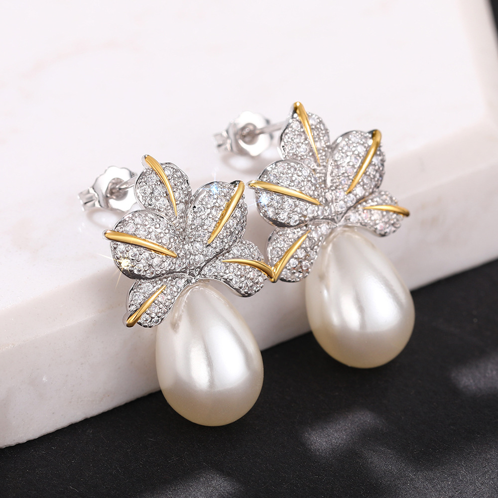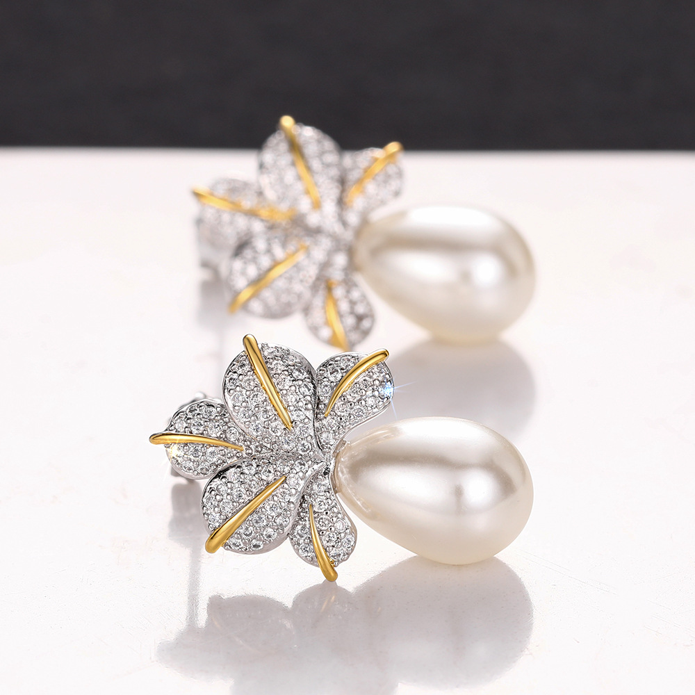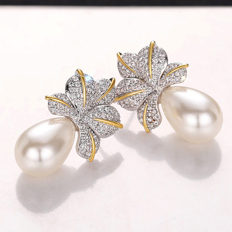 European and American leaf imitation pearl earrings, shining inlaid with zircon earrings, women's light luxury style elegant earrings